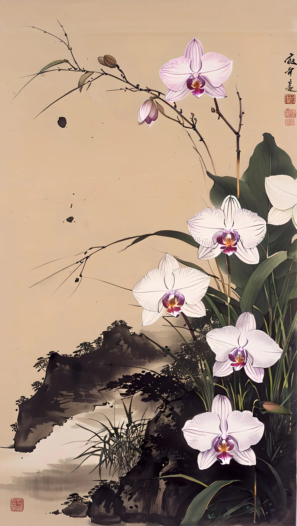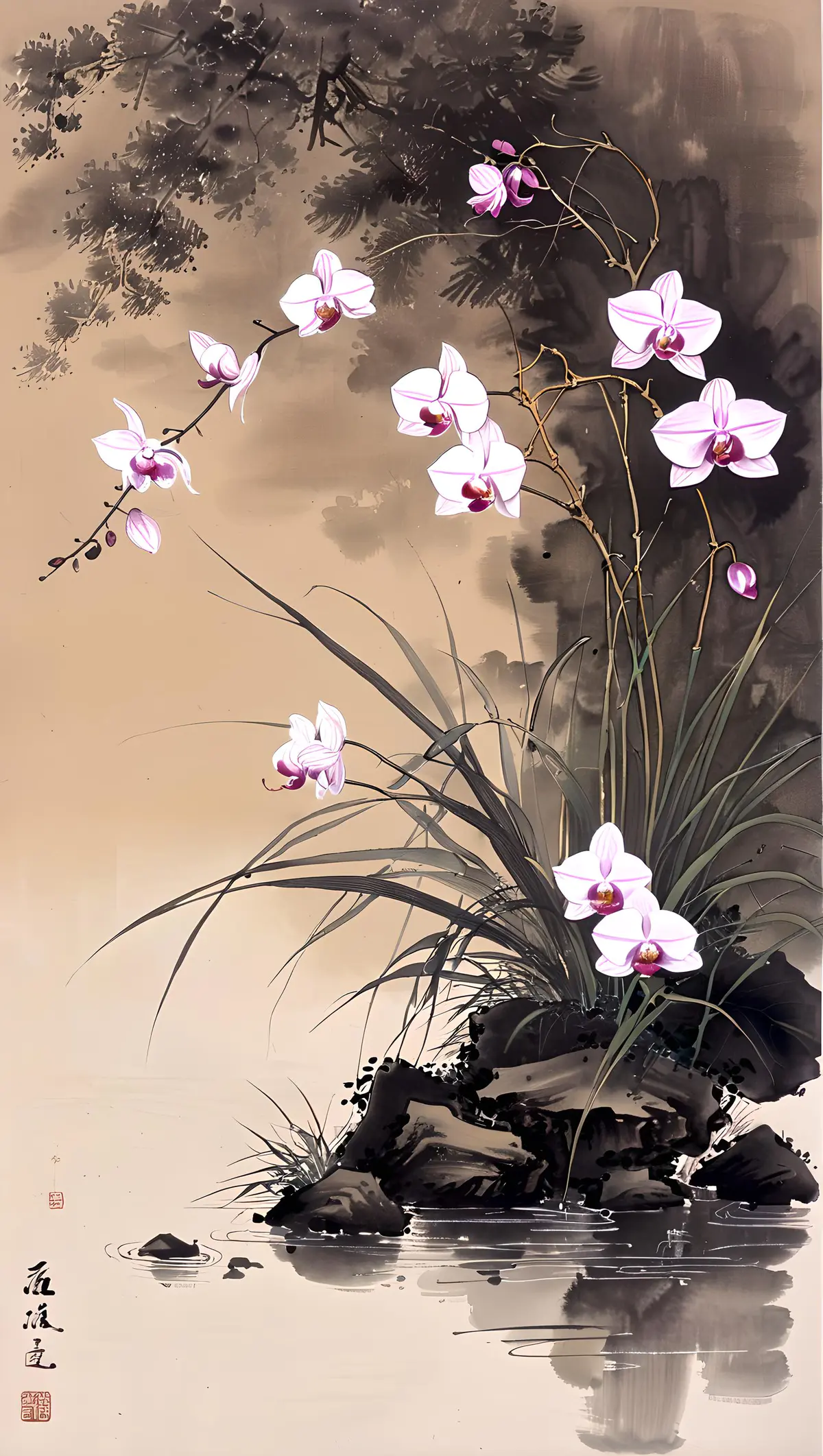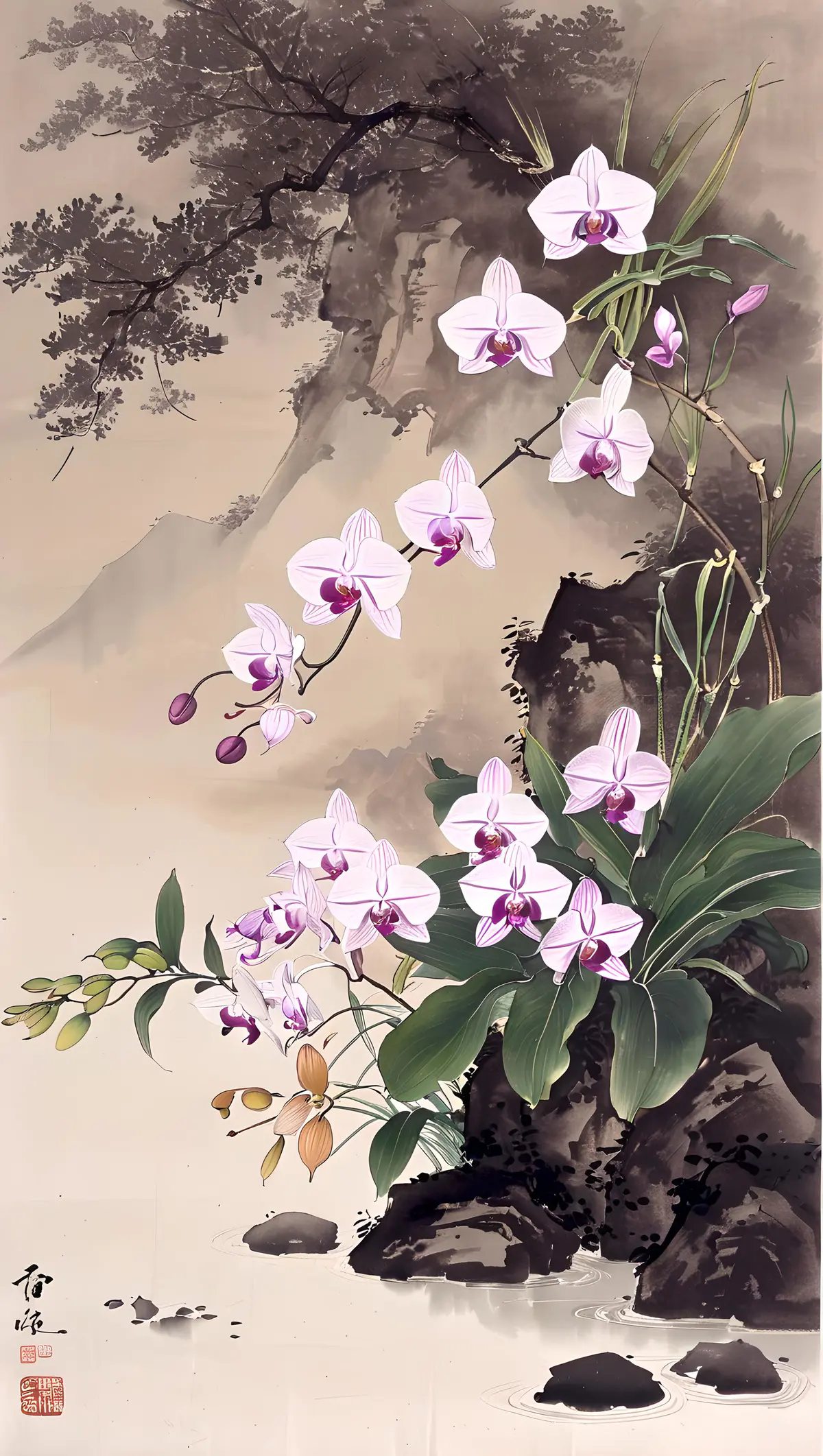 兰花的花朵形态多样,有单瓣、复瓣之分,颜色丰富,包括白、黄、绿、紫、红等多种色彩,以及复色和斑纹品种,各具风姿。花瓣薄而透明,质地细腻,排列整齐,有的品种花瓣边缘还微微卷曲,显得尤为精致。花心中常有雄蕊和雌蕊,雄蕊数目众多,花丝细长,花药饱满;雌蕊则位于花朵中央,柱头明显。具有中国画的风格、它细节精致,色彩优雅,捕捉自然光线、背景是一幅水墨山水画、加题词、印章、8K、高分辨率。