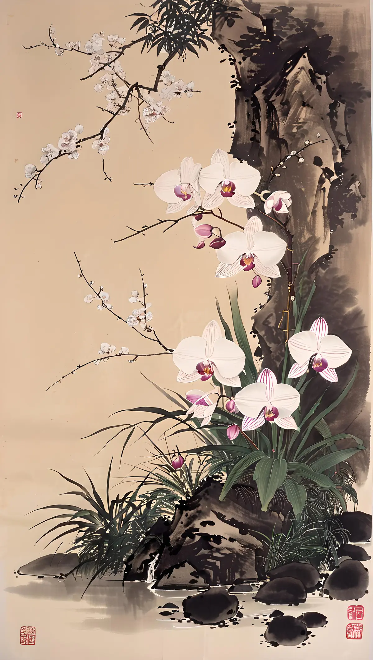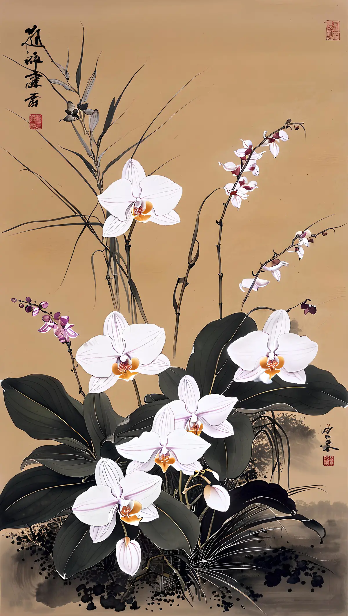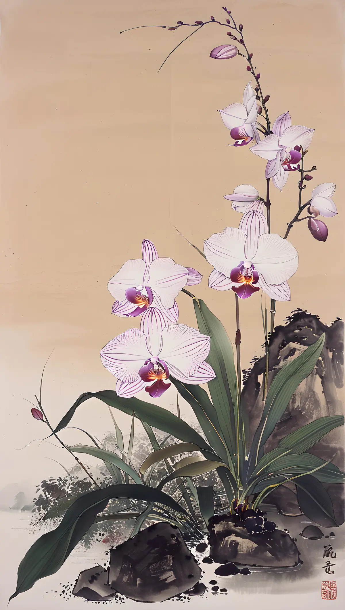 兰花的花朵形态多样,有单瓣、复瓣之分,颜色丰富,包括白、黄、绿、紫、红等多种色彩,以及复色和斑纹品种,各具风姿。花瓣薄而透明,质地细腻,排列整齐,有的品种花瓣边缘还微微卷曲,显得尤为精致。花心中常有雄蕊和雌蕊,雄蕊数目众多,花丝细长,花药饱满;雌蕊则位于花朵中央,柱头明显。具有中国画的风格、它细节精致,色彩优雅,捕捉自然光线、背景是一幅水墨山水画、加题词、印章、8K、高分辨率。