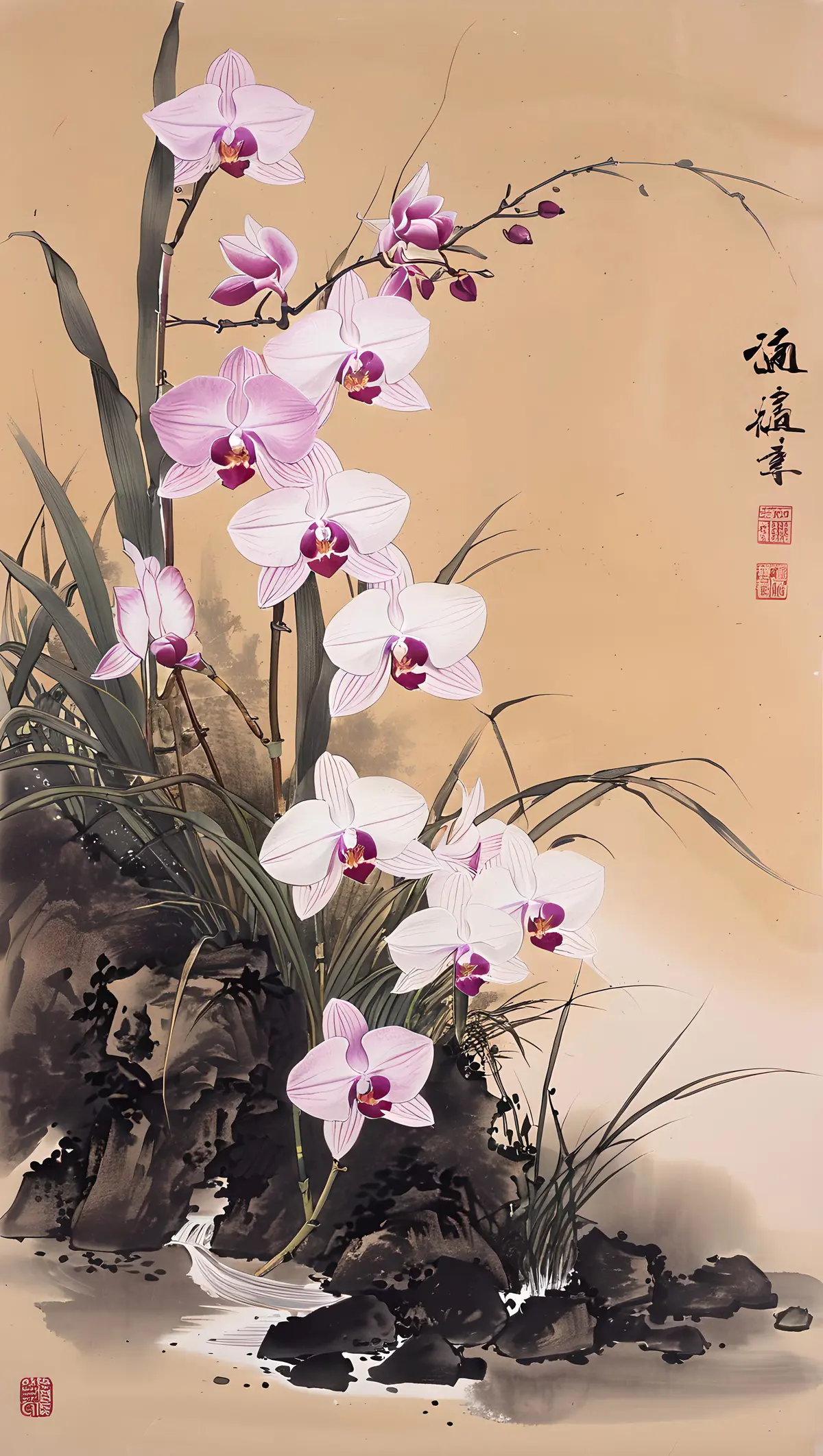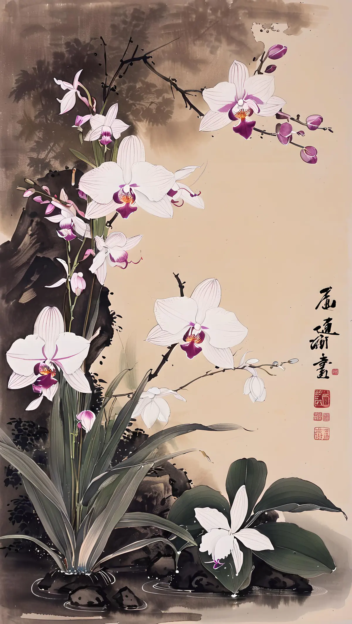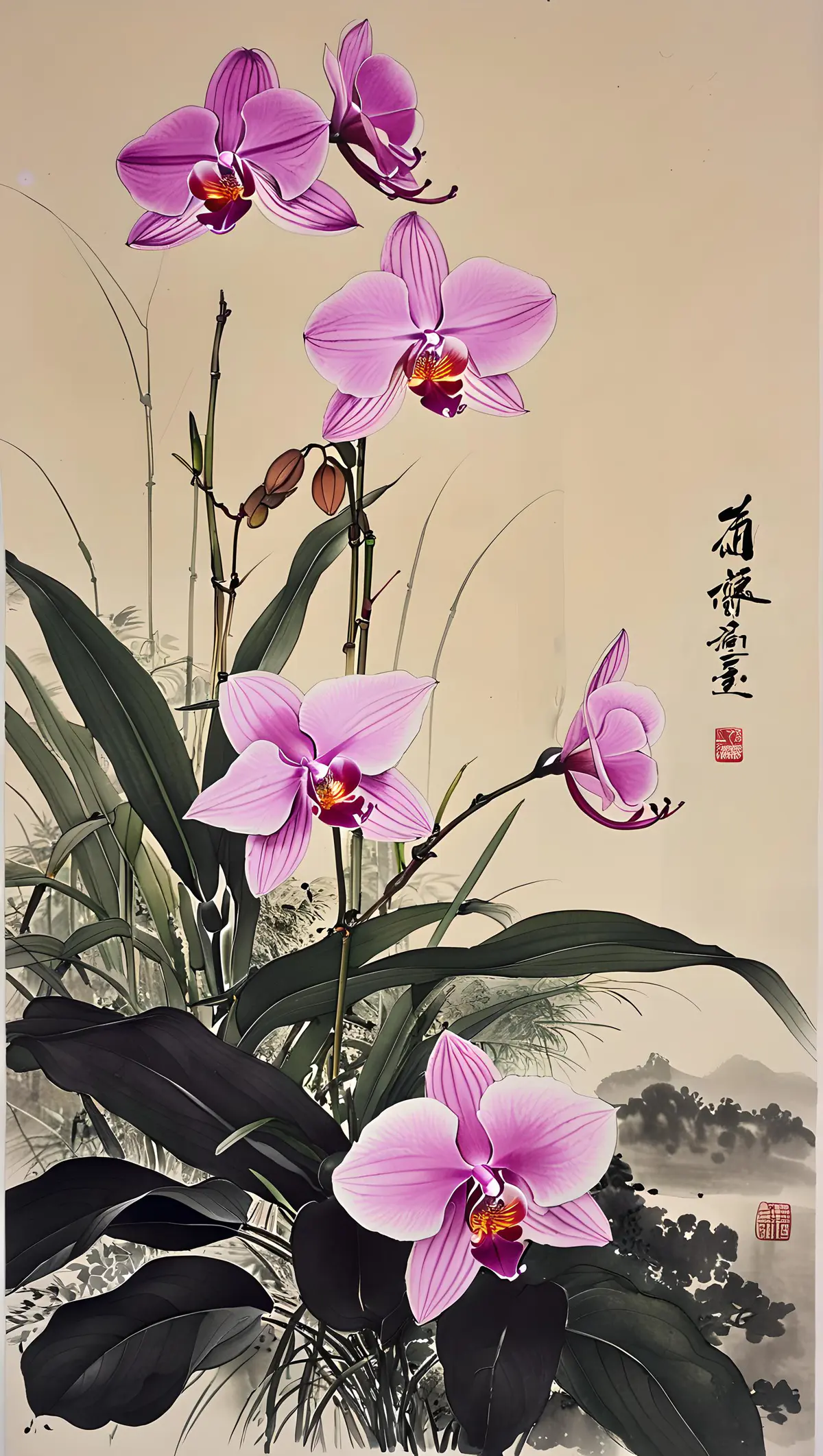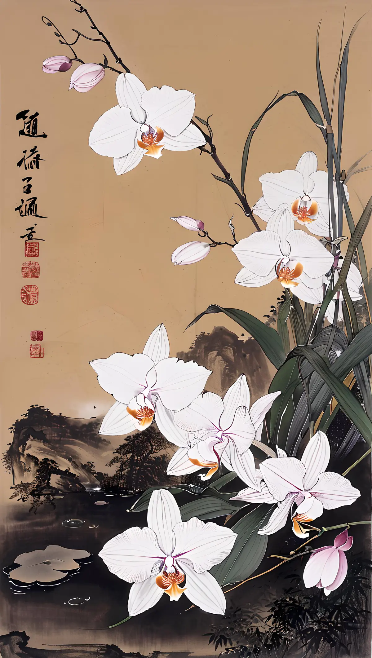 兰花的花朵形态多样,有单瓣、复瓣之分,颜色丰富,包括白、黄、绿、紫、红等多种色彩,以及复色和斑纹品种,各具风姿。花瓣薄而透明,质地细腻,排列整齐,有的品种花瓣边缘还微微卷曲,显得尤为精致。花心中常有雄蕊和雌蕊,雄蕊数目众多,花丝细长,花药饱满;雌蕊则位于花朵中央,柱头明显。具有中国画的风格、它细节精致,色彩优雅,捕捉自然光线、背景是一幅水墨山水画、加题词、印章、8K、高分辨率。