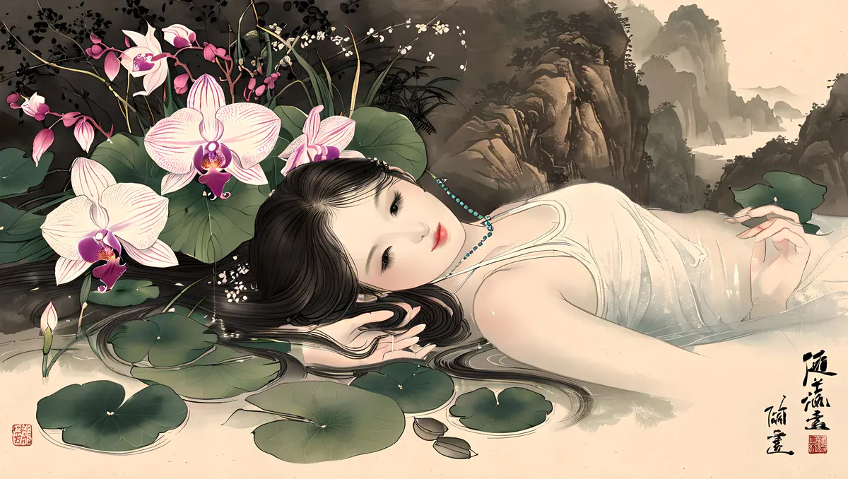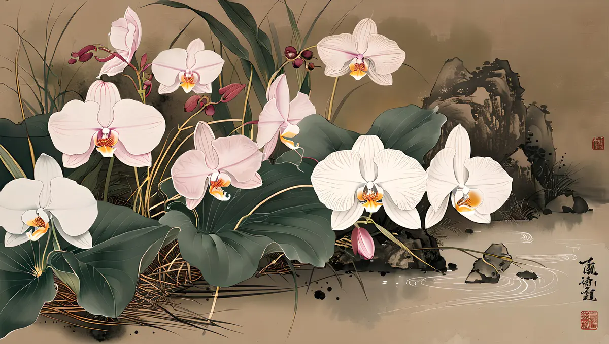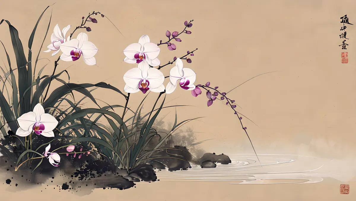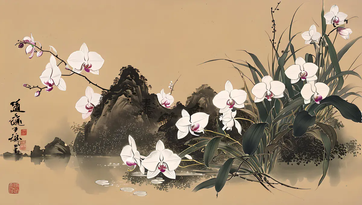 兰花的花朵形态多样,有单瓣、复瓣之分,颜色丰富,包括白、黄、绿、紫、红等多种色彩,以及复色和斑纹品种,各具风姿。花瓣薄而透明,质地细腻,排列整齐,有的品种花瓣边缘还微微卷曲,显得尤为精致。花心中常有雄蕊和雌蕊,雄蕊数目众多,花丝细长,花药饱满;雌蕊则位于花朵中央,柱头明显。具有中国画的风格、它细节精致,色彩优雅,捕捉自然光线、背景是一幅水墨山水画、加题词、印章、8K、高分辨率。