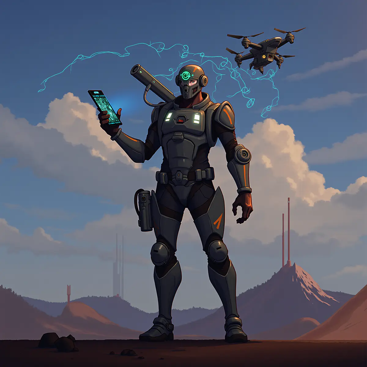 (masterpiece, best quality, 8k), 1 male, "Northern Frontier Guardian" IP character, full body, age 25-35, heroic, reliable, wearing a modern tactical suit with reflective stripes, integrated HUD visor on helmet, a drone hovering over his shoulder, holding a tablet that shows a holographic map, (background: Ulanqab's prairie and volcanic landscape, swirling clouds, digital data streams flowing in the air), professional lighting, epic composition, cel shading, 3D render style, vibrant colors, blue and orange color theme, symbol of safety and technology.