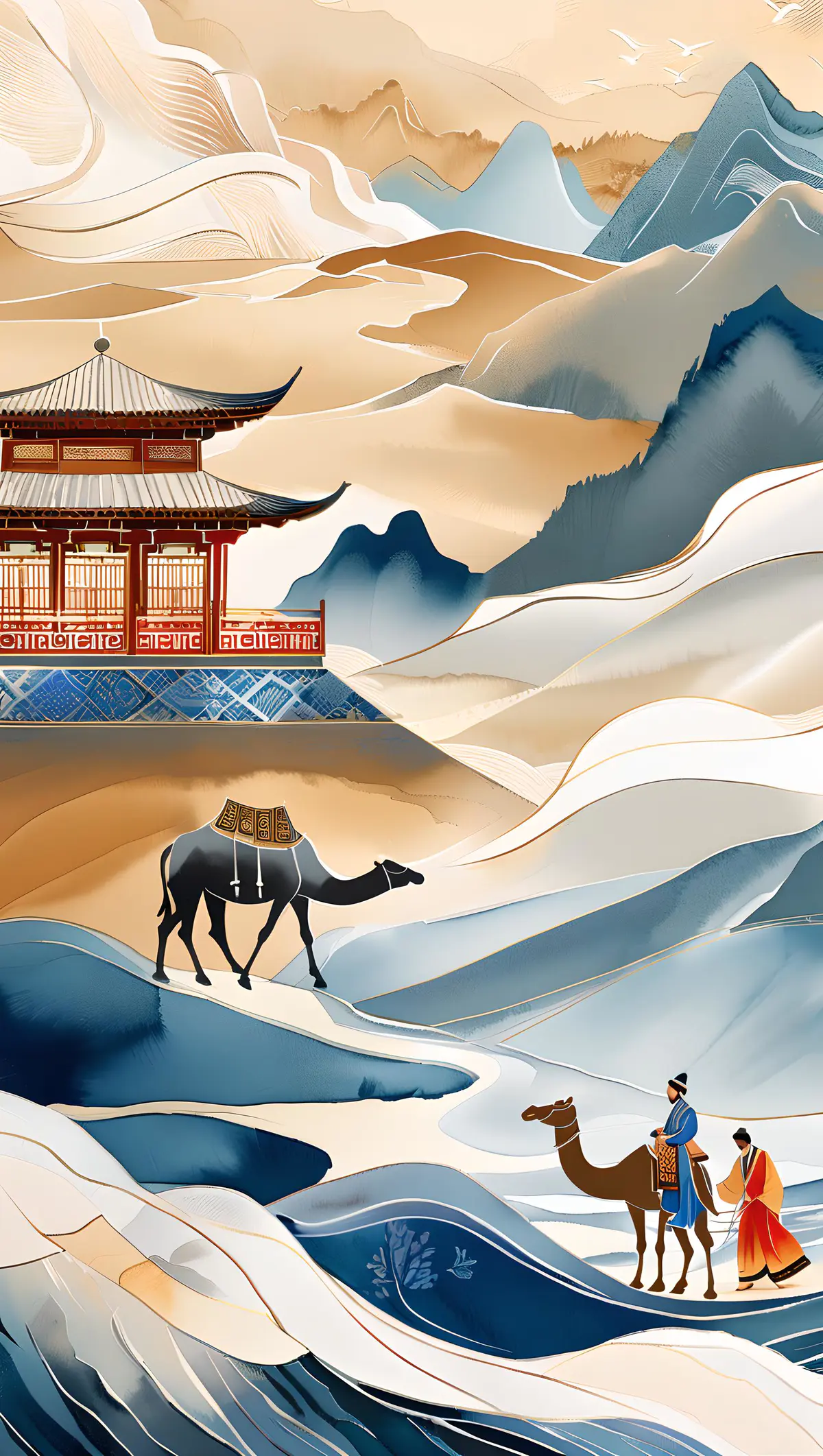一张平铺画面,背景是浙江烟雨江南的场景自然过渡到新疆的辽阔戈壁的场景上。右上方印有水彩画,晕染塑造立体感,高色彩密度,居中对角线斜构图的一条骆驼丝绸之路,超写实,垂直俯拍,骆驼后排一个身穿新疆服饰的美女跳赛乃...查看更多