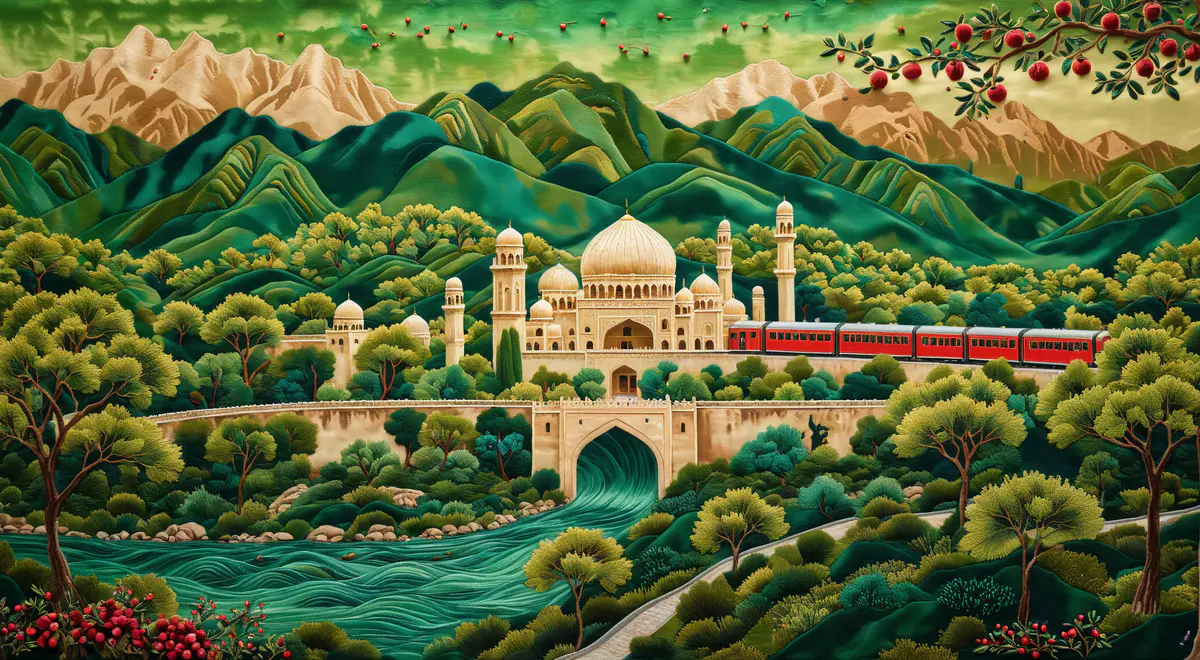 以浙江刺绣与阿克苏毛毡材质混合制作的画作,画中有阿克苏清真寺,阿克苏特产石榴等,展现出从浙江到阿克苏的高铁经济合作之路,代表着浙江与阿克苏的合作春天的到来