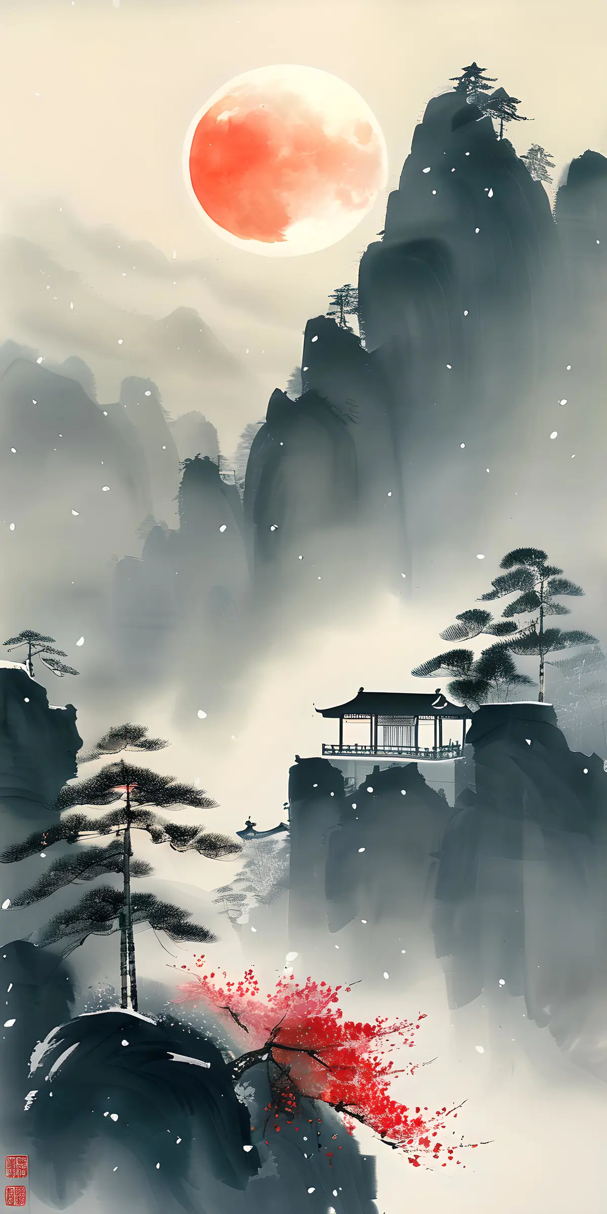 生成一幅典雅的中国传统水墨画,二十四节气“立冬”主题,冬日清新、灵动且充满东方诗意场景。画面中,描绘出远山、流云的形态,中景有白色的圆月与雪景点缀,背景是刚入冬的不是大雪,天空中有冰蓝调绘远山流云,覆盖薄雪的中式建筑在山间错落分布、覆雪的树木剪影,点缀几株红梅。主色调为蓝色、浅灰,营造出宁静和谐、生机盎然的氛围。水墨晕染风格,笔触写意,宣纸质感,充满东方古典韵味。