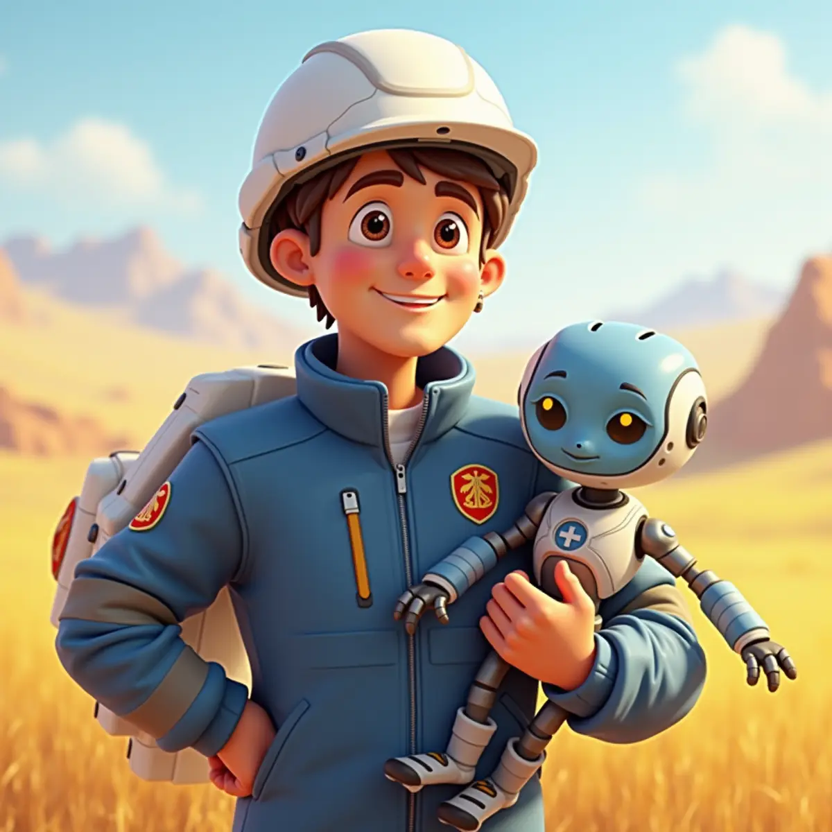 (best quality, detailed illustration), 1 friendly male character, "Safety Big Brother", smiling confidently, wearing a functional emergency rescue jacket (blue), a safe helmet, holding a friendly AI robot companion, (background: a modern emergency education base, Ulanqab grassland under sunny sky), warm lighting, soft shadows, Pixar style, 3D cartoon, approachable and trustworthy, mascot design, clean background.