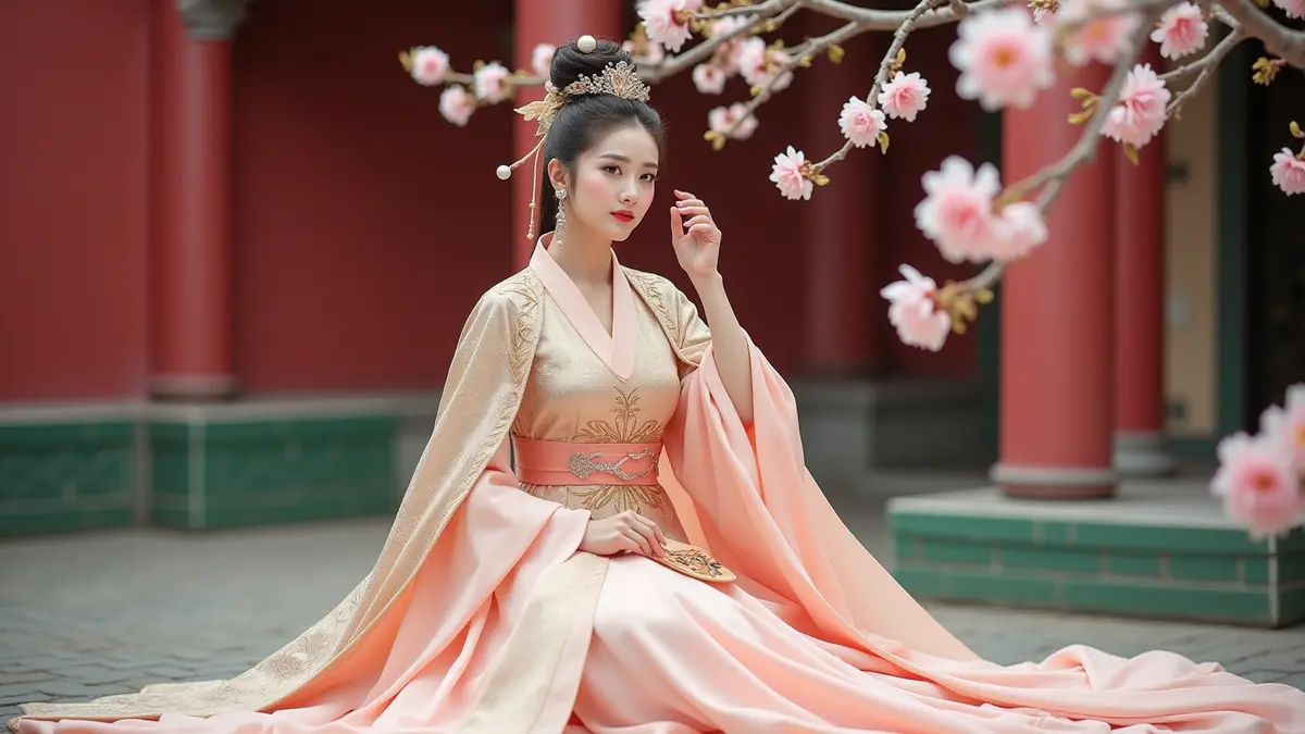 精致华丽的宫廷汉服写真,一位宛如古代公主的女子端坐于桃花盛开的庭院中。她身着繁复的明制汉服,外披一件绣有金丝凤凰图案的霞帔,内穿淡粉色交领襦裙,腰束宽幅织金带,裙摆层层叠叠,如同绽放的花瓣。女子面容姣好,眉眼如画,发髻高耸,珠翠满头,一缕青丝垂至腰际。她手中轻握一把扇子,微启朱唇,眼神温柔地望向镜头。背景是古典园林,红墙绿瓦,桃花纷飞,春意盎然。运用高饱和度色彩和细腻光影,营造出一幅唯美浪漫的古风画卷。High-definition realistic photography,三分法构图,聚焦于人物面部表情与服饰细节。