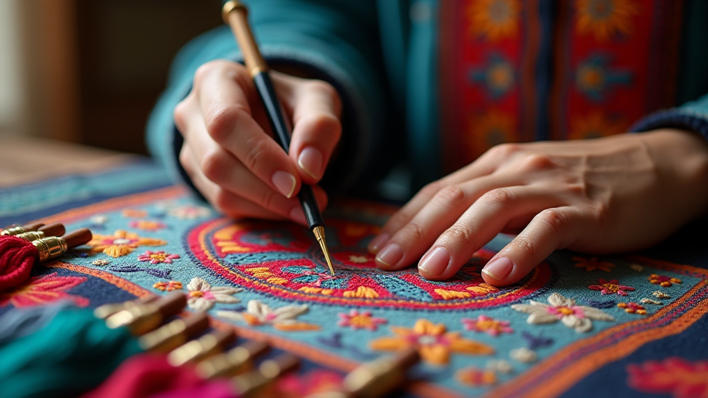 柯尔克孜族的刺绣装饰,图案色彩丰富,多采用对称设计,展现出浓郁的民族风格。刺绣花纹别致,彩色布料上绣出花卉等图案,细腻精美,具有很强的装饰性。