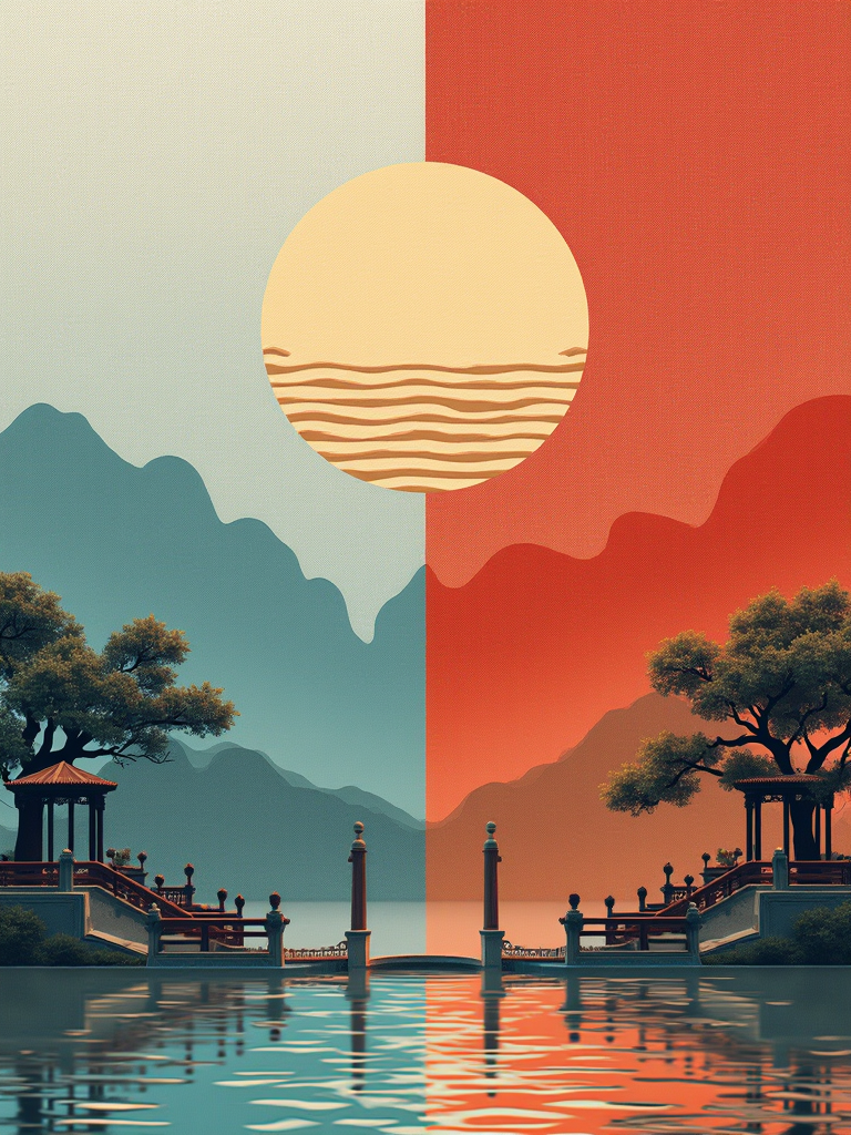 这幅作品以对称构图将浙江与阿克苏的地理与文化元素巧妙融合。左半部分的青灰色山水与江南亭台,象征浙江的烟雨朦胧与丝绸文化;右半部分的暖红色沙漠与胡杨,则代表阿克苏的丝路风情与艾德莱斯绸传统。中央的圆形元素既是西...查看更多