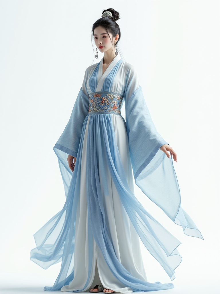 核心主体:虚拟形象,性别中性,身形修长舒展,兼具江南灵秀与西域俊朗气质;文化融合:服饰以浙江非遗(杭绣针脚、龙泉青瓷釉色、蚕桑纹样)为基底,点缀阿克苏非遗(艾德莱斯绸渐变几何纹、维吾尔族花帽简化轮廓、桑皮纸肌理),配饰融入两地符号(浙江龙井茶叶造型挂坠、阿克苏巴旦木纹样腰饰);现代化诠释:服饰剪裁简约利落(如短款束腰、阔腿裤/伞裙),材质混搭(哑光面料+局部反光细节),发型新潮(短发/半扎发,点缀非遗纹样发饰),面部妆容淡雅,眉眼间带传统纹样隐形彩绘;风格细节:线条流畅,色彩和谐(青瓷青、艾德莱斯红/蓝、米白为基调),背景为极简白色,融入丝路元素抽象线条,整体兼具非遗厚重感与潮流设计感,适用于文创周边、数字IP衍生,高分辨率,细节精致。