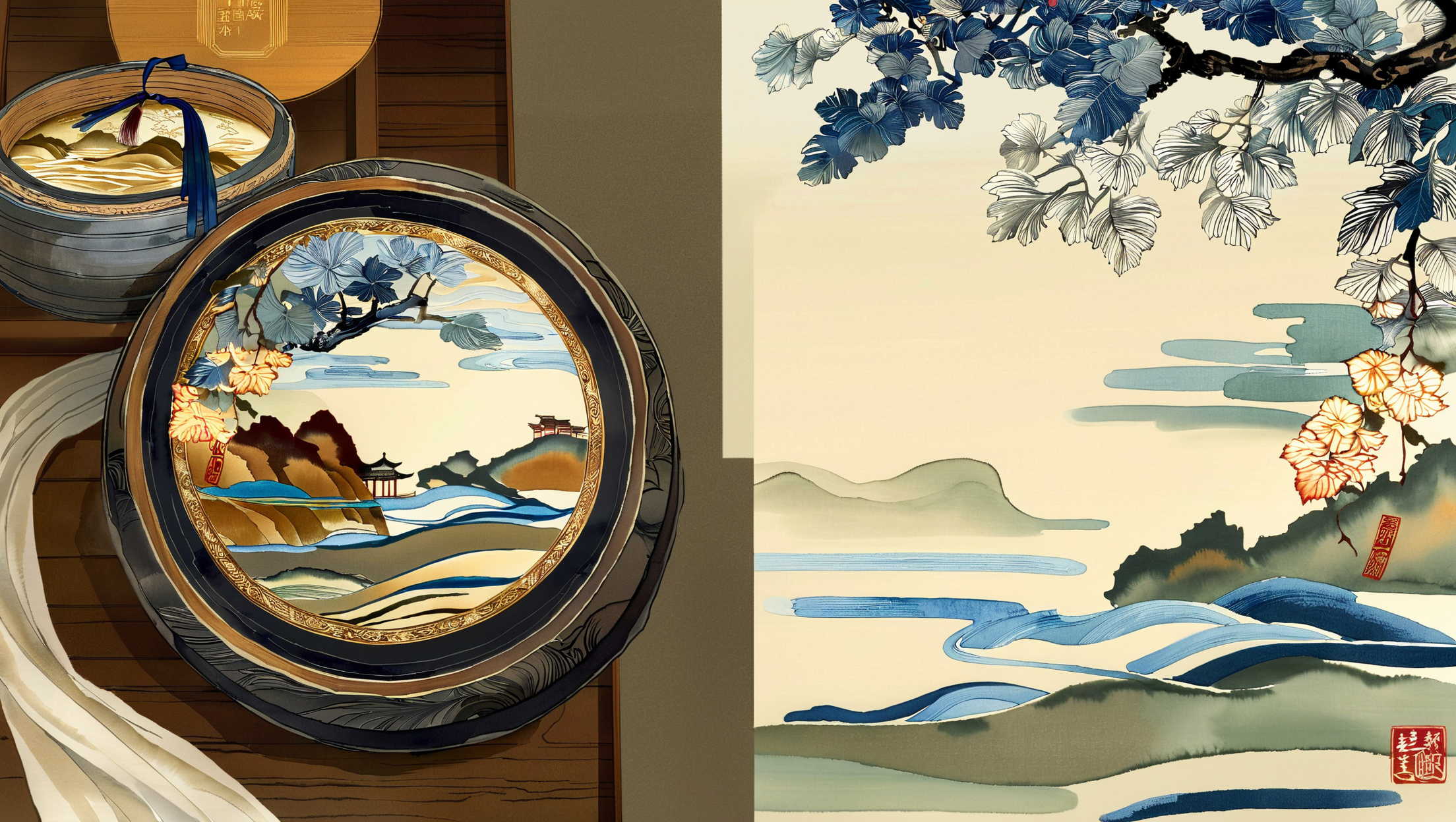 礼盒的底座是阿克苏胡杨木雕刻的西湖断桥景观。背景中,有若隐若现的江南丝绸薄纱与柯尔克孜族刺绣图案作为衬托。打光精致,突出青瓷的温润光泽与酒液的晶莹剔透,整体色调高雅,充满传承与共享的寓意,产品摄影风格,细节极致。