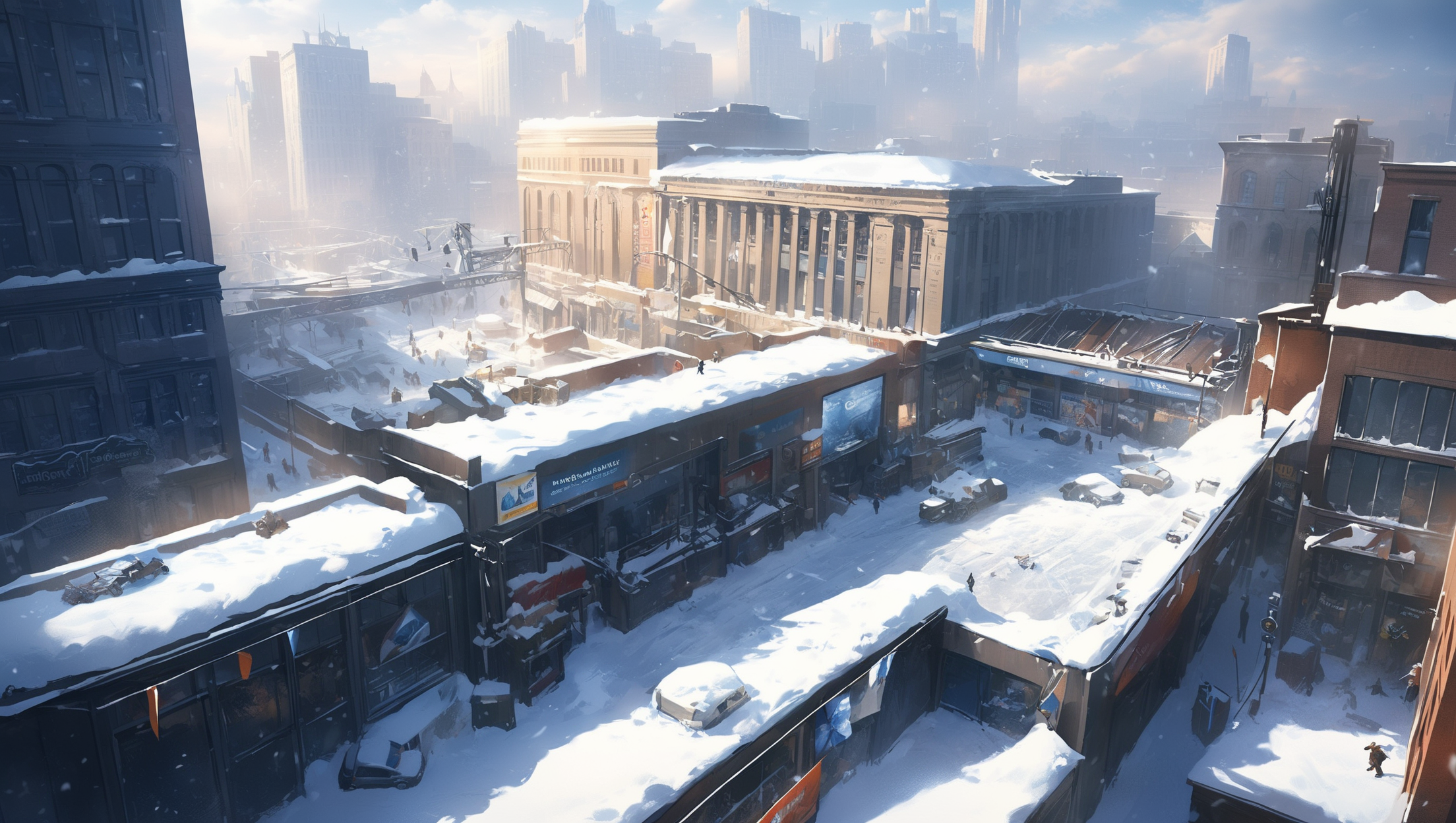 冻结的末世城市景象,建筑被冰层包裹,碎裂窗户反射寒光,寂静的车辆埋入积雪,冷色青白调,光影强对比,照片级细节,带“michal k.store”标志。