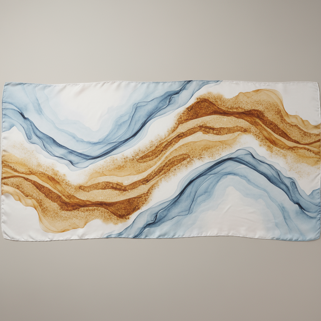 丝巾的抽象图案,西湖的雾气与阿克苏的沙漠风沙缠绕在一起,代表丝绸之路的金线连接着散落的蓝印花布和玉石元素,优雅且具有象征意义