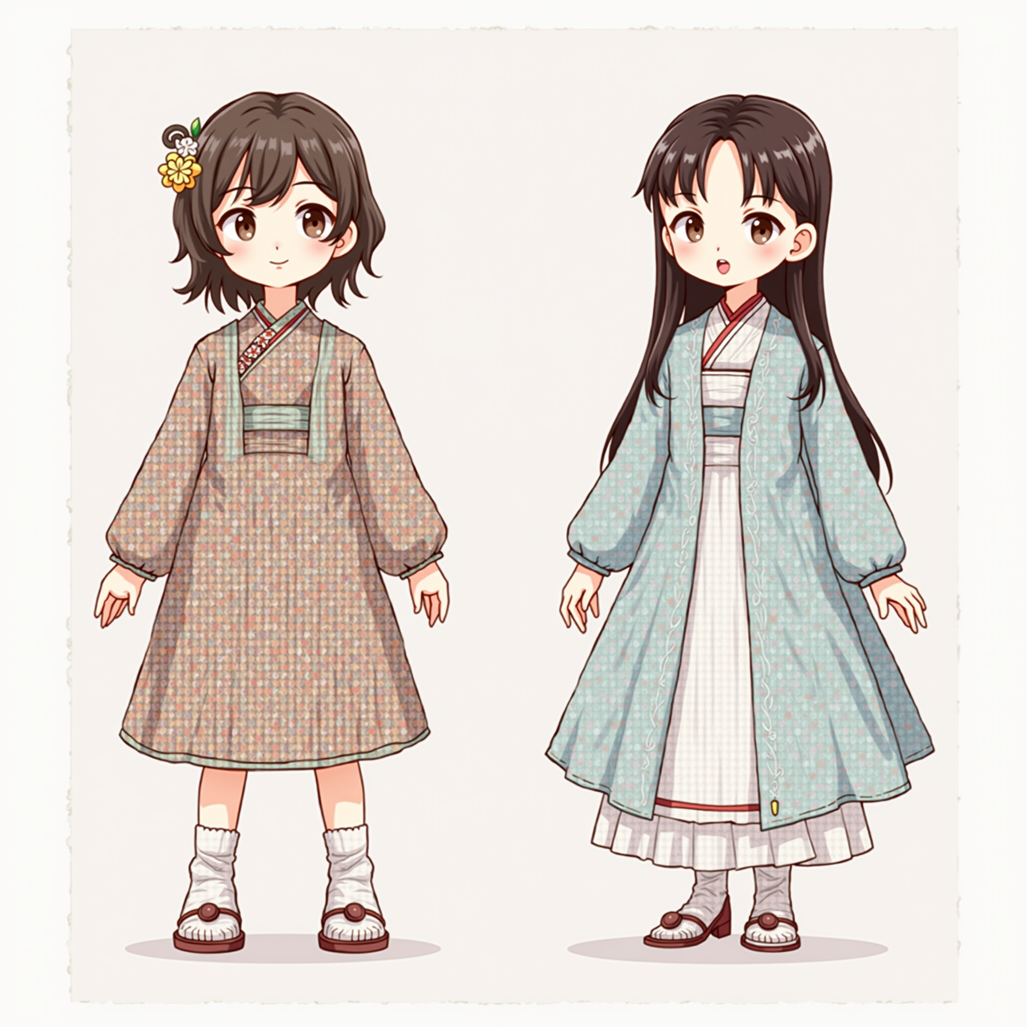 形象1的服饰纹样,融合杭罗“细格肌理”与艾德莱斯绸的“柔和色彩晕染”,发饰选用浙江桂花(地域标识),鞋履参考阿克苏传统麻鞋样式,体现“浙织技艺+阿地风貌”的共生感;