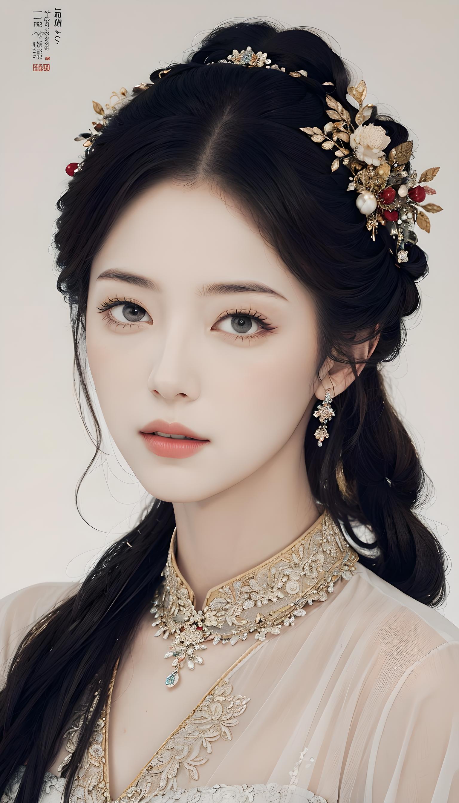 帮我生成图片:16岁的古风人物女,场景宫廷下雨,镜头全身远景拍摄,柔和的光影勾勒人物轮廓,低角度仰拍构图,营造静谧松弛感,日常快照风格,自然柔和光线。眼神深邃,故事感,情绪感,鬓角发丝凌乱自然垂落,随机动态视角,人像摄影,精心构图或打光,美女,五官精致冷艳,身着宫装长流苏发饰,,白色的纱质广绣流仙裙注意衣领腰封和袖口细节。完美身材,身材傲人,超细节,冷白匀净清透细腻的皮肤。风格真实人物写真