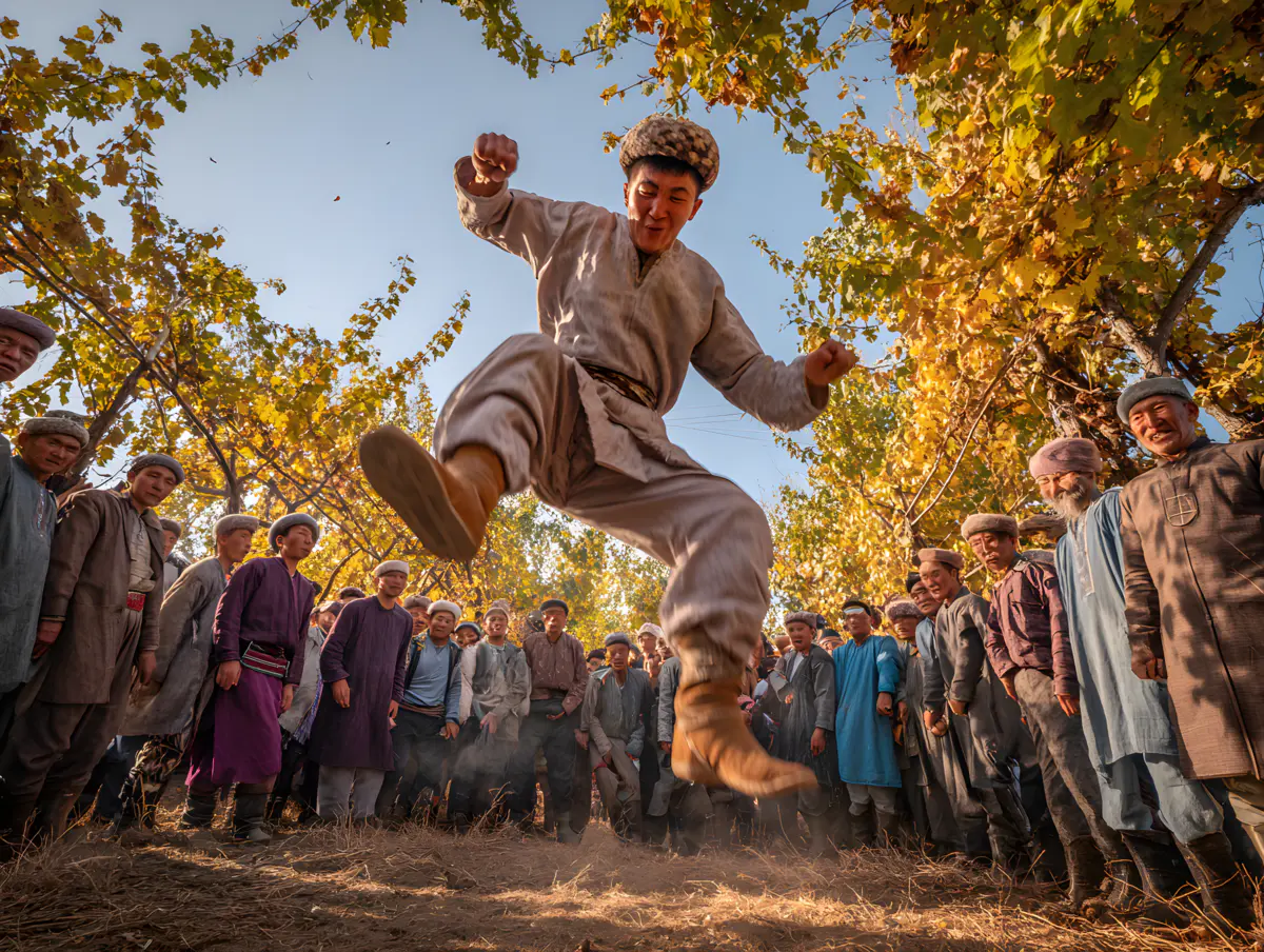一张充满动感的专业摄影作品,采用高速快门抓拍。在阿克苏金色的秋日葡萄园中,一群维吾尔族民众正围绕着篝火举行刀郎麦西热甫。一位年轻的男舞者在人群中央激情地跳跃,表情充满喜悦与力量。在人群的边缘,一位来自浙江的游客看得入了迷,她手中拿着一杯当地的慕萨莱思,脖子上围着一条不显眼的杭州丝绸围巾。画面焦点在舞者身上,游客和背景的葡萄藤架则略带虚化,强调动态与静态的对比,色彩饱和度高,充满纪实感和艺术张力。