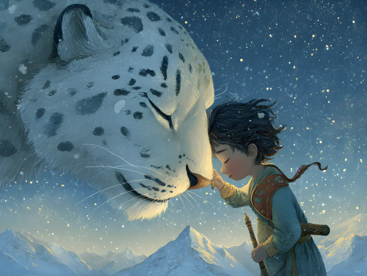 一幅古典风格的儿童神话绘本插画。在静谧的雪山之巅,一位柯尔克孜族小牧童正与一只巨大的雪豹额头相抵,仿佛在倾听着古老的秘密。雪豹的皮毛在月光下泛着淡淡的青色光辉,仔细看,上面竟有类似龙泉青瓷开片的精美纹理。小牧童的鹰笛上,系着一小段来自浙江的丝绸,随风微动。背景是璀璨的星空和连绵的雪山,画面色彩柔和,笔触细腻,充满和平、宁静与万物和谐的童话气息。