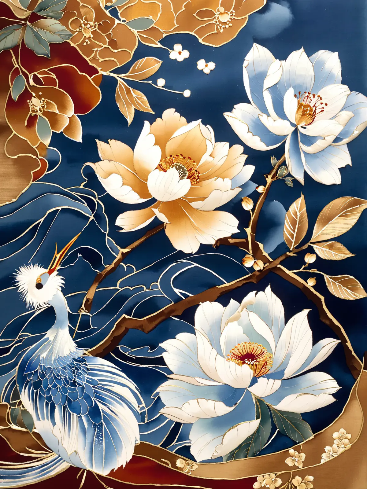 画面中的仙鹤可象征浙江文化的灵动雅致(如瓯绣的细腻、丝绸的飘逸),也可隐喻新疆文化的自由奔放(如哈萨克族的游牧精神、柯尔克孜族史诗的雄浑);绽放的花卉融合了江南牡丹的温婉与西域花饰的艳丽,代表浙阿非遗元素的碰...查看更多