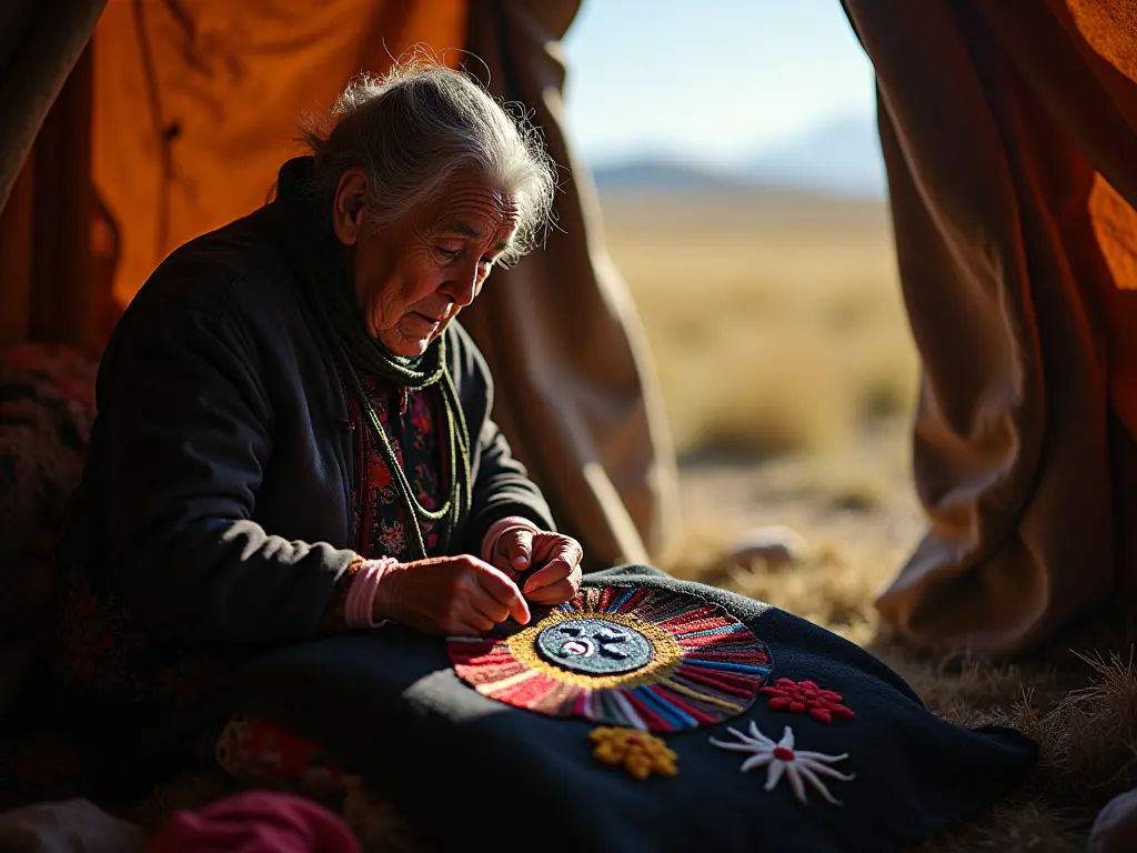 国家地理风格的纪实肖像摄影,一位美丽但年迈的柯尔克孜族妇女,布满皱纹的脸上刻着岁月的智慧,眼神宁静而深邃。她坐在自家帐篷的入口处,帕米尔高原午后的阳光柔和地洒在她身上,形成伦勃朗式的光影效果。特写镜头聚焦于她布满老茧的双手,正灵巧地在一块深色羊毛毡上进行传统刺绣,绣出日月星辰的图腾。画面细节极其丰富,能够看到羊毛毡的纤维和丝线的柔滑光泽。采用索尼A7R IV相机拍摄,85mm f/1.4 G Master镜头,景深极浅,背景是虚化的草原