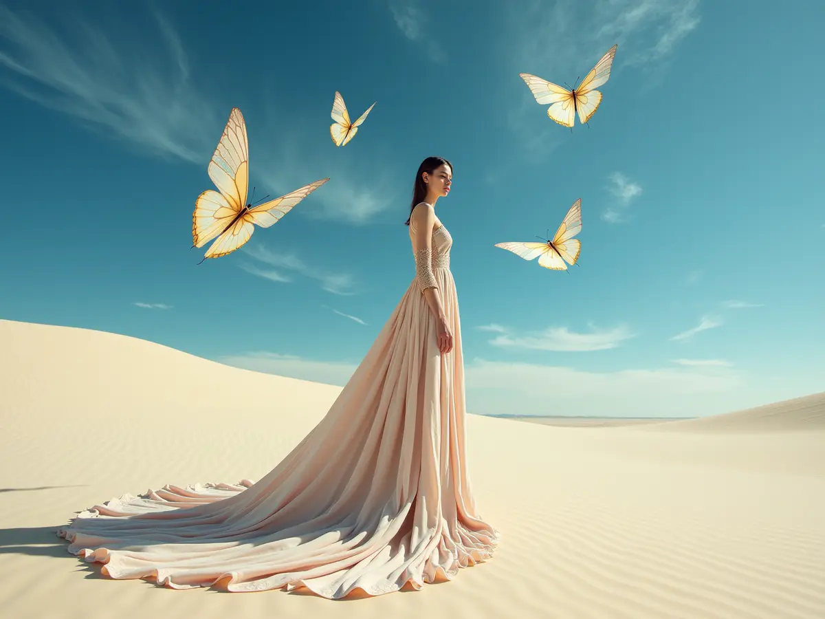 一幅超现实主义时尚摄影大片。一位高挑优雅的西域模特,身穿一件由艾德莱斯绸制成的华丽长裙,裙摆如瀑布般垂下,与沙漠的沙丘融为一体。她静静地站立在塔克拉玛干沙漠的中央,天空是梵高《星夜》风格的旋转星云。几只巨大的、轻微透明的蝴蝶,翅膀上是艾德莱斯绸的纹样,正围绕着她缓缓飞舞。画面构图极简,色彩对比强烈,模特的皮肤质感细腻,绸缎的反光和沙粒的质感清晰可见,整体呈现出一种神秘而梦幻的氛围。