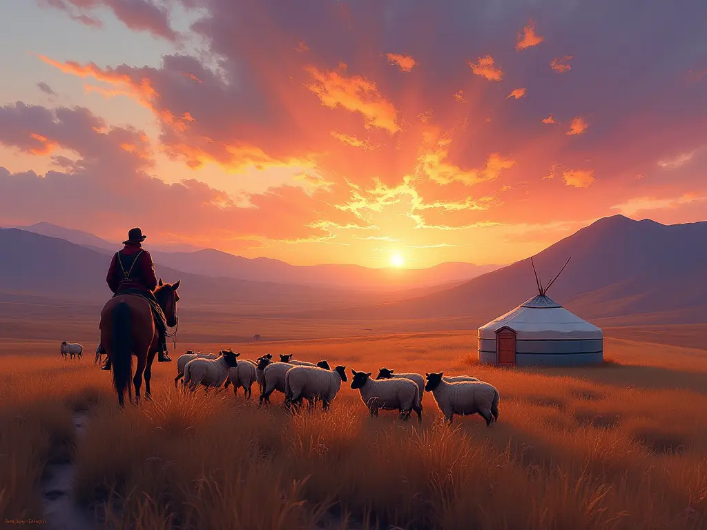 一幅印象派风格的数字油画。黄昏时分,天山脚下的草原被夕阳染成金色和紫色的交响。一位柯尔克孜族牧民骑着马,身后跟随着一群羊,正缓缓走向远处的毡房。牧民的身影在逆光中呈现出剪影,但他的传统服饰和小花帽的轮廓清晰可辨。天空是莫奈式的云彩,用短促而有力的笔触描绘,色彩从橙红渐变到深蓝。整幅画面充满了流动感和诗意,笔触松散而富有表现力,营造出一种梦幻般的田园牧歌氛围。