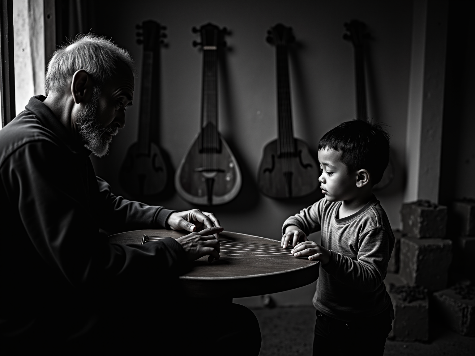 充满情感的黑白纪实摄影。在阿瓦提县一个简朴的土屋里,一位年迈的刀郎木卡姆老艺人,正手把手地教他的小孙子弹奏卡龙琴。柔和的窗光照亮了他们专注的侧脸,老人的手上布满青筋和皱纹,小孩的手则稚嫩而认真。背景的墙上挂着几把磨损的旧乐器,诉说着岁月的故事。画面构图紧凑,聚焦于两双手和琴弦的互动,高对比度的黑白影调强化了照片的故事感和历史厚重感。