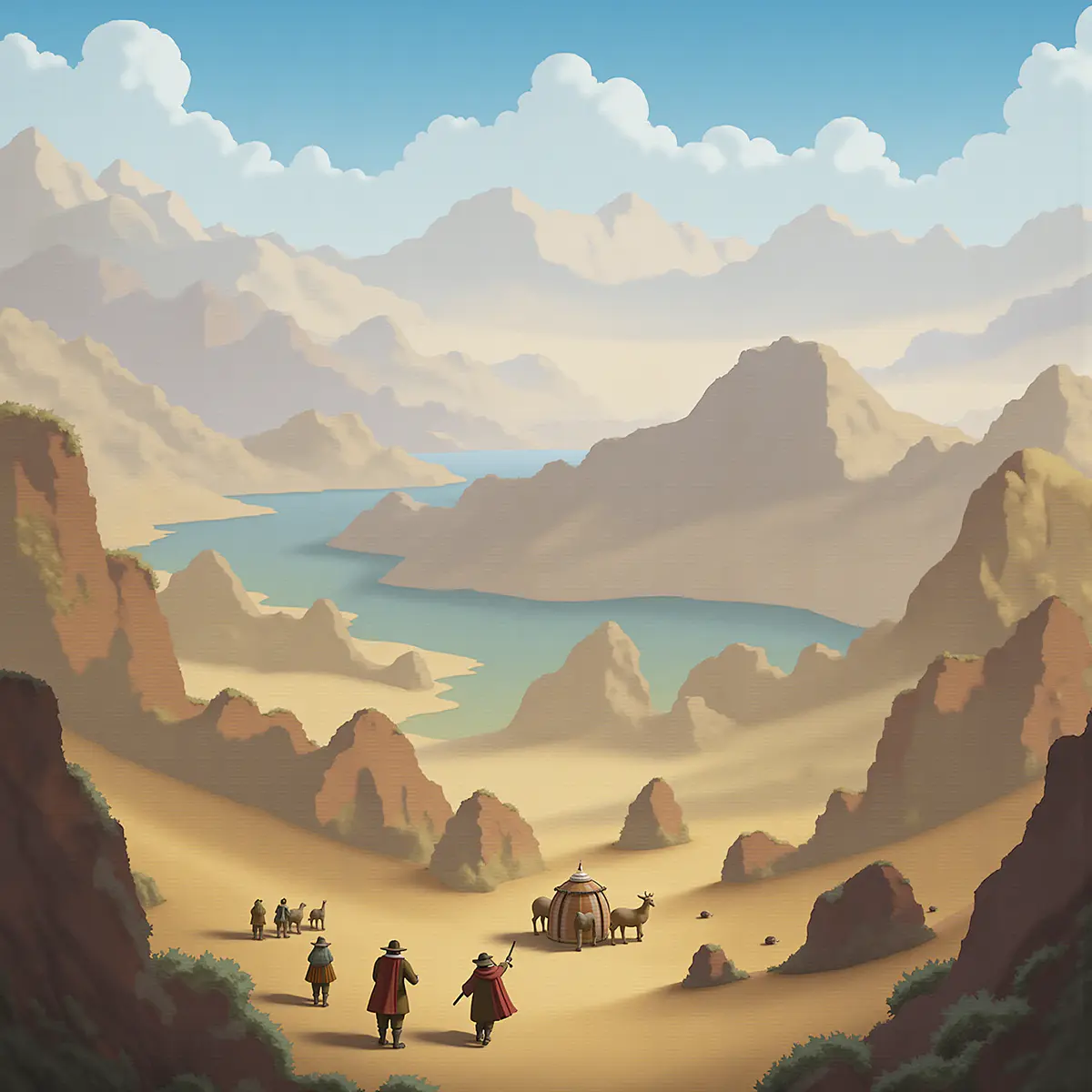这幅插画以“丝路文化”为联结纽带,融合新疆阿克苏的沙漠绿洲地貌、游牧毡房元素,同时暗合浙江作为丝路东方商贸起点的文化属性。画面用暖调肌理铺陈沙漠质感,澄澈湖泊点染出绿洲生机,商旅队伍、驼群与毡房的互动,既还...查看更多