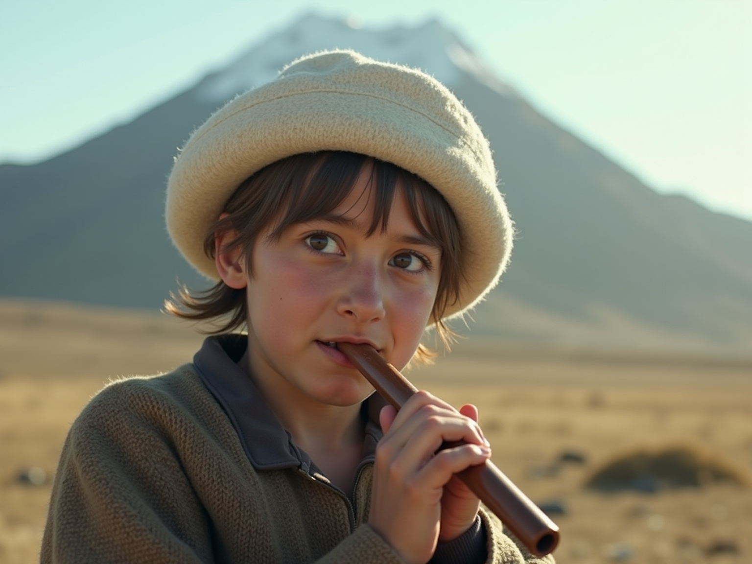 电影感肖像特写,一位五官俊朗的柯尔克孜族少年,约18岁,眼神清澈明亮,带着一丝忧郁。他身穿简约的民族服饰,头戴一顶白色毡帽。背景是壮丽的帕米尔高原,远处是慕士塔格峰的雪顶。他正将一支鹰笛送到唇边,仿佛即将吹奏。逆光拍摄,金色的轮廓光勾勒出他的头发和脸部线条。采用变形宽银幕镜头拍摄,画面有轻微的镜头光晕和电影颗粒感,色调参考了电影《燃情岁月》