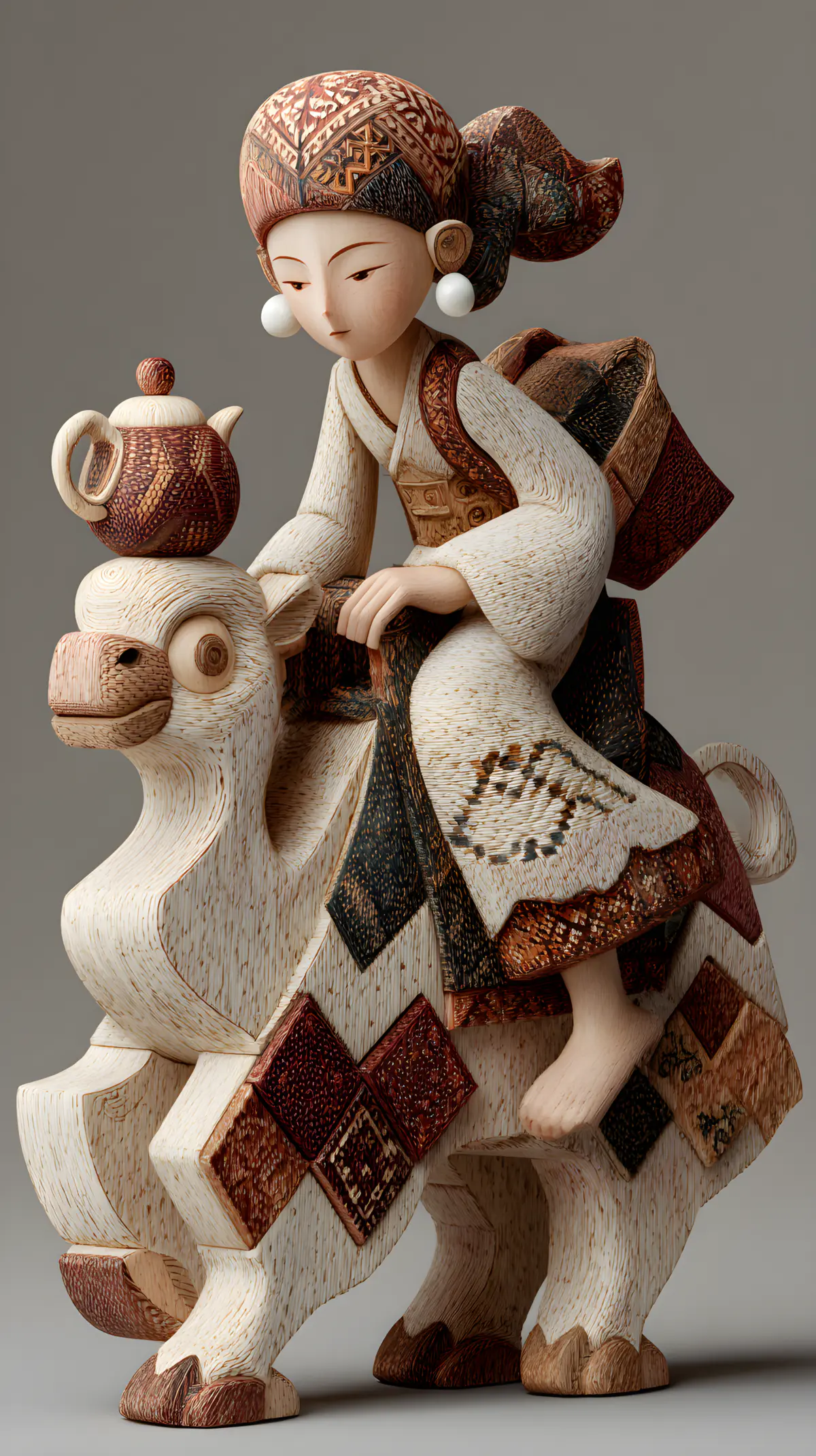 维吾尔族木雕。一位无脸的舞蹈女孩戴着珍珠耳环骑在一匹卧在地上的骆驼身上,手中拿着茶壶的创意组合3维立体摆件,局部施以矿物颜料点缀。木质,立体工艺品摆件,三维立体雕刻技法,上面雕刻着杏花、葡萄藤、石榴花的纹样,周围还有菱形纹抽象图案。纯色背景,c4d渲染,虚拟引擎渲染,中景,完整展示,写实风格