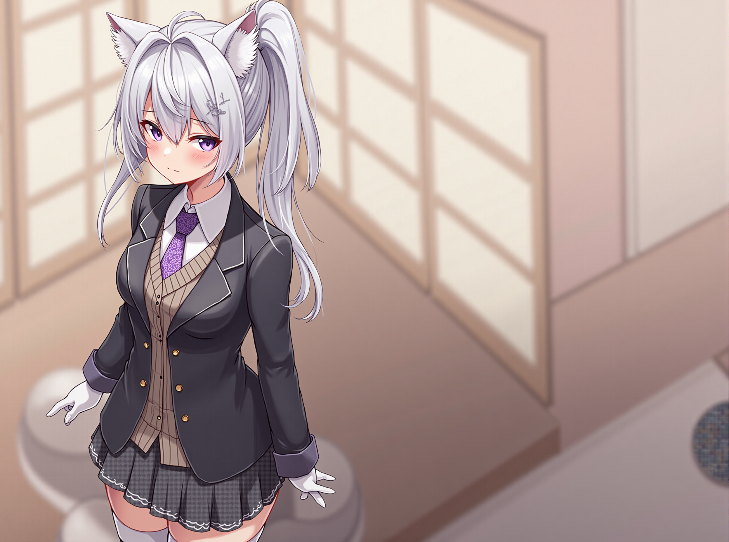 **female, young adult female**(long silver hair:1.5), straight hair, cat ear bows, high ponytail, full bangs, fair skin, purple eyes,** graceful neck.slender waist, toned figure, voluptuous figure,large breasts,slight curves,** (black tailored blazer:1.5), brown knit cardigan, white shirt, purple patterned tie, grey and black plaid mini skirt, thigh-high socks, white gloves