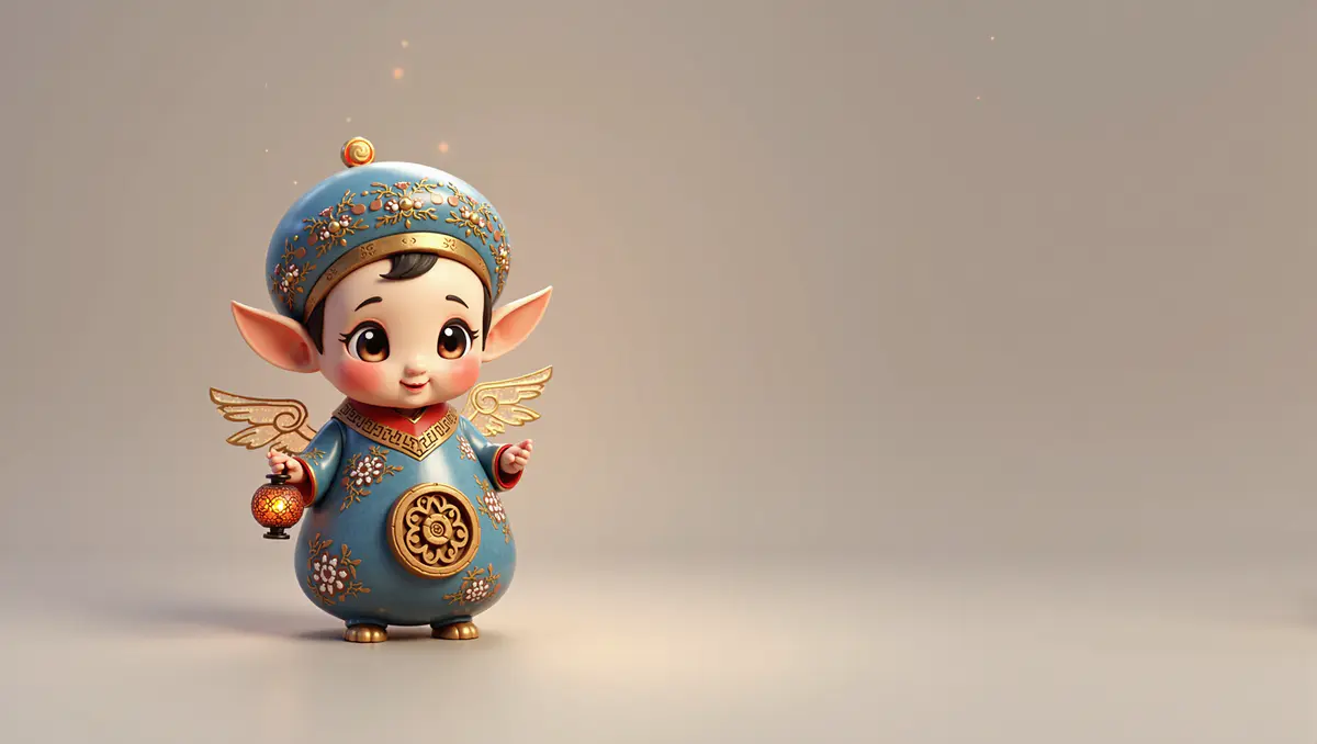一只融合阿克苏与浙江文化的可爱文旅IP形象,整体为萌系卡通风格。形象主体为一只小精灵般的角色,头部带着维吾尔族花帽,帽上带有阿克苏特色花卉刺绣图案。身体采用“龙泉青瓷”的光泽质感,圆润饱满,呈龙泉青色。腰部点缀东阳木雕纹路的小木牌,带明显的江南木纹细节。手持胡杨木色的小灯笼,灯笼形态来自“江南柔光 × 西域花影”的艺术灯具,透出温暖柔光与几何花影。整体风格萌软、圆润、治愈,拥有大眼睛、微笑、自然亲和感,背后有一对会发光的小翅膀,视觉符号强调:龙泉青、刺绣红、竹韵米、皮革褐、胡杨棕。背景为超现实柔光、轻微粒子、文旅感强的视觉氛围,呈现跨地域融合的文化符号。高清、干净、海报级细节表达。
