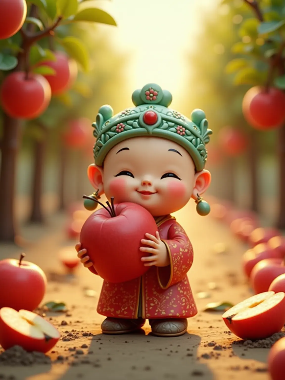 合三星堆青铜面具元素的卡通毛绒玩偶,头戴带有回纹装饰的浅绿色冠饰,脸部圆润,红扑扑的腮红,笑眯眯的表情。它身处阳光明媚的苹果园,手持一颗超大的红苹果,周围苹果树挂满红苹果,地上有切开的苹果,整体是写实与卡通结...查看更多