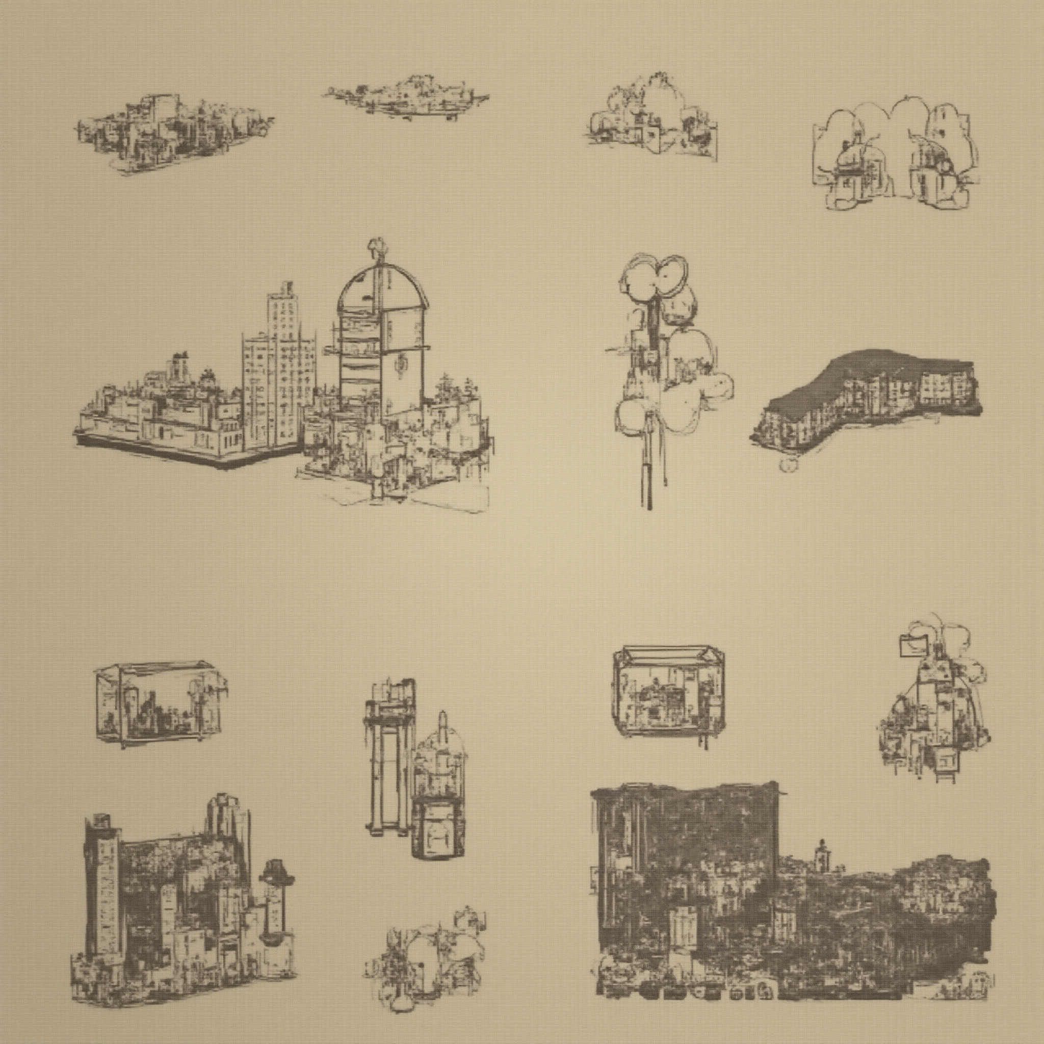 画面以浅米色布纹质感为底,散落着多幅黑笔线条绘制的建筑小稿——既有密集的城市建筑群轮廓,也有带穹顶、高楼的现代建筑组合,还有被“框选”在容器中的微型建筑,甚至出现了抽...查看更多