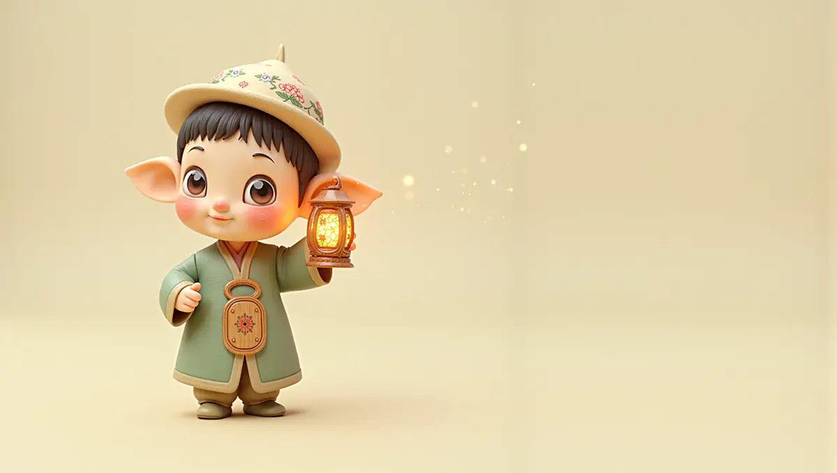 一只融合阿克苏与浙江文化的可爱文旅IP形象,整体为萌系卡通风格。形象主体为一只小精灵般的角色,头部饰有“竹编+柯尔克孜族皮雕纹样”的小帽,呈浅竹韵米色与皮革褐色柔和搭配,帽上带有阿克苏特色花卉刺绣图案,头顶的竹编小斗笠轻巧透气,织纹间点缀着阿克苏柯尔克孜族刺绣花纹与皮雕符号。他的身体呈温润的青瓷色,带着龙泉青瓷般的光泽与圆润质感,身体采用“龙泉青瓷”的光泽质感,圆润饱满,呈龙泉青色。腰部点缀东阳木雕纹路的小木牌,带明显的江南木纹细节。手持胡杨木色的小灯笼,灯笼形态来自“江南柔光 × 西域花影”的艺术灯具,透出温暖柔光与几何花影,一盏由竹编与皮雕结合的小灯笼,灯芯透出的金色暖光如江南雾雨般柔和,又带着西域落日的余辉。他轻轻一举灯,便能在地面投射出独有的“花影纹光”。整体风格萌软、圆润、治愈,拥有大眼睛、微笑、自然亲和感,视觉符号强调:龙泉青、刺绣红、竹韵米、皮革褐、胡杨棕。背景为超现实柔光、轻微粒子、文旅感强的视觉氛围,呈现跨地域融合的文化符号。高清、干净、海报级细节表达。