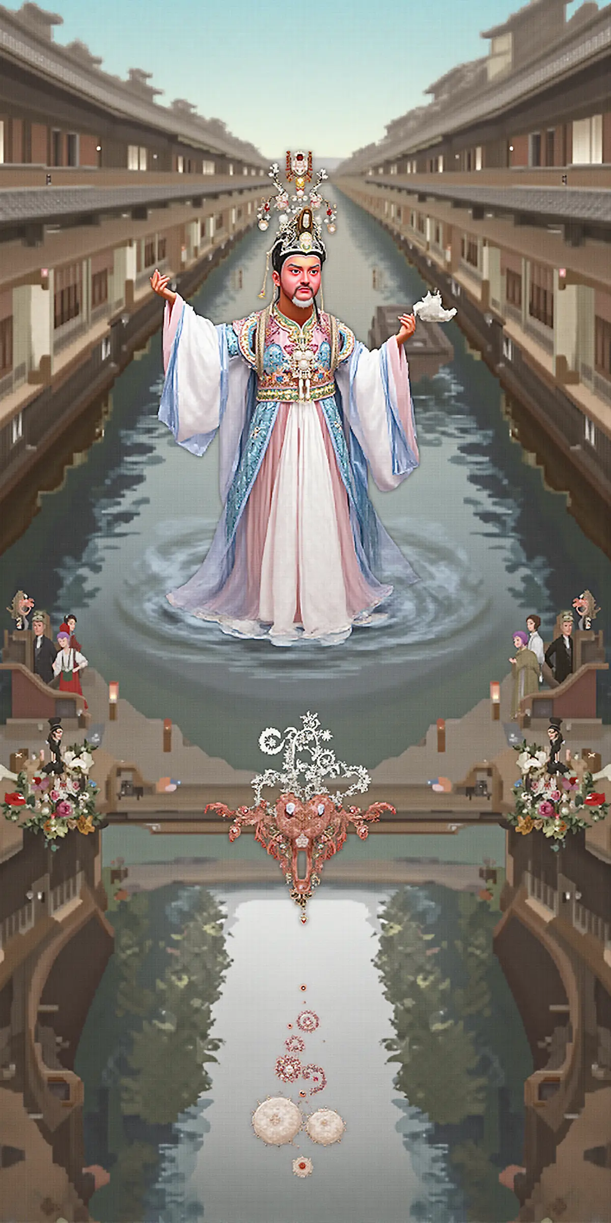 - 场景与意象:以江南水乡为底色,石拱桥、乌篷船、白墙黛瓦构建出温婉的地域氛围;主体是身着昆曲旦角戏服的表演者,正于织机旁打理绣品——戏服的刺绣纹样(牡丹、缠枝纹)与织机上的绣品呼应,既体现江南刺绣的非遗技艺...查看更多