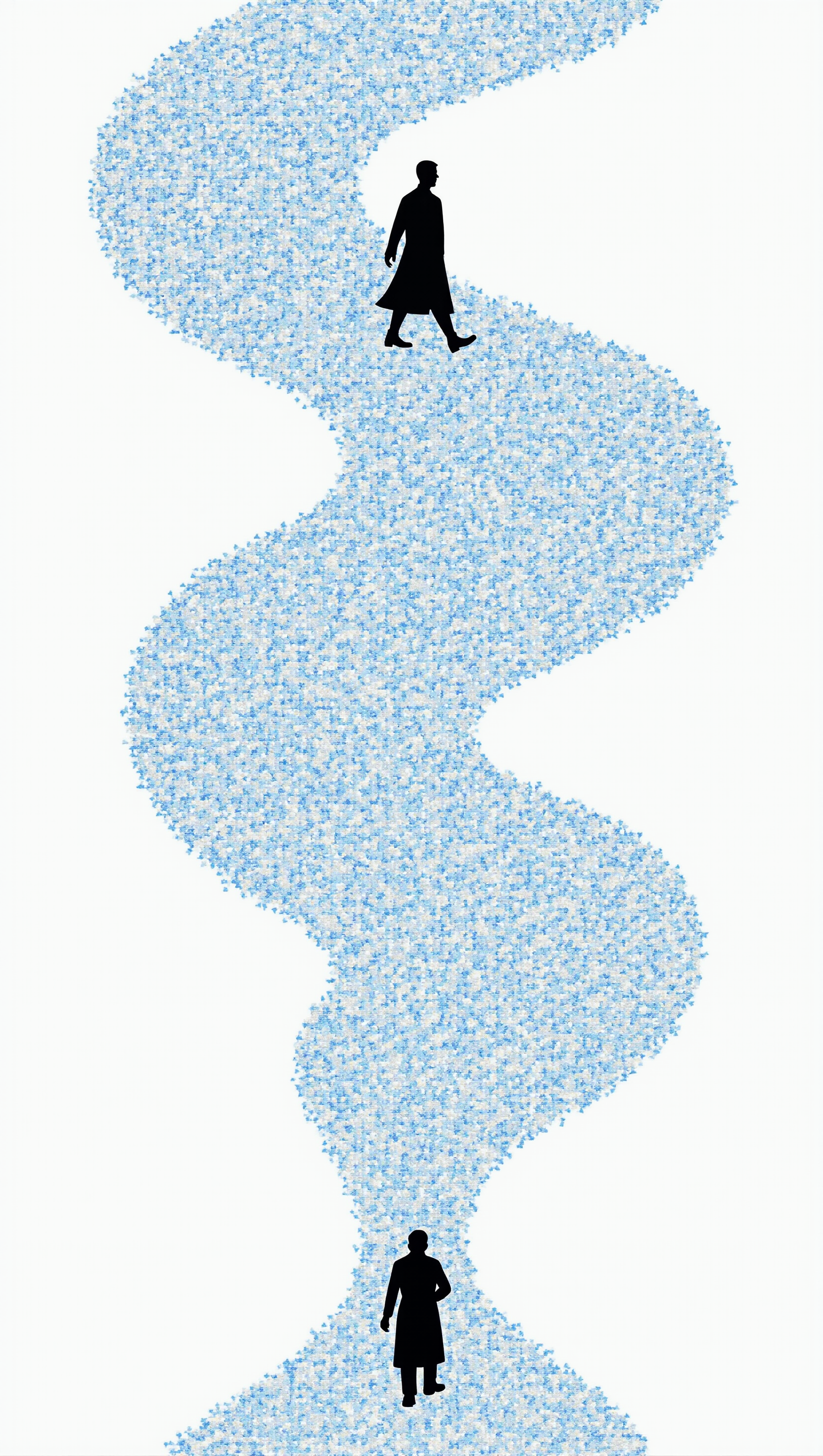 有一个身穿新疆传统服饰的黑色小人在身穿浙江服饰的人群中逆行