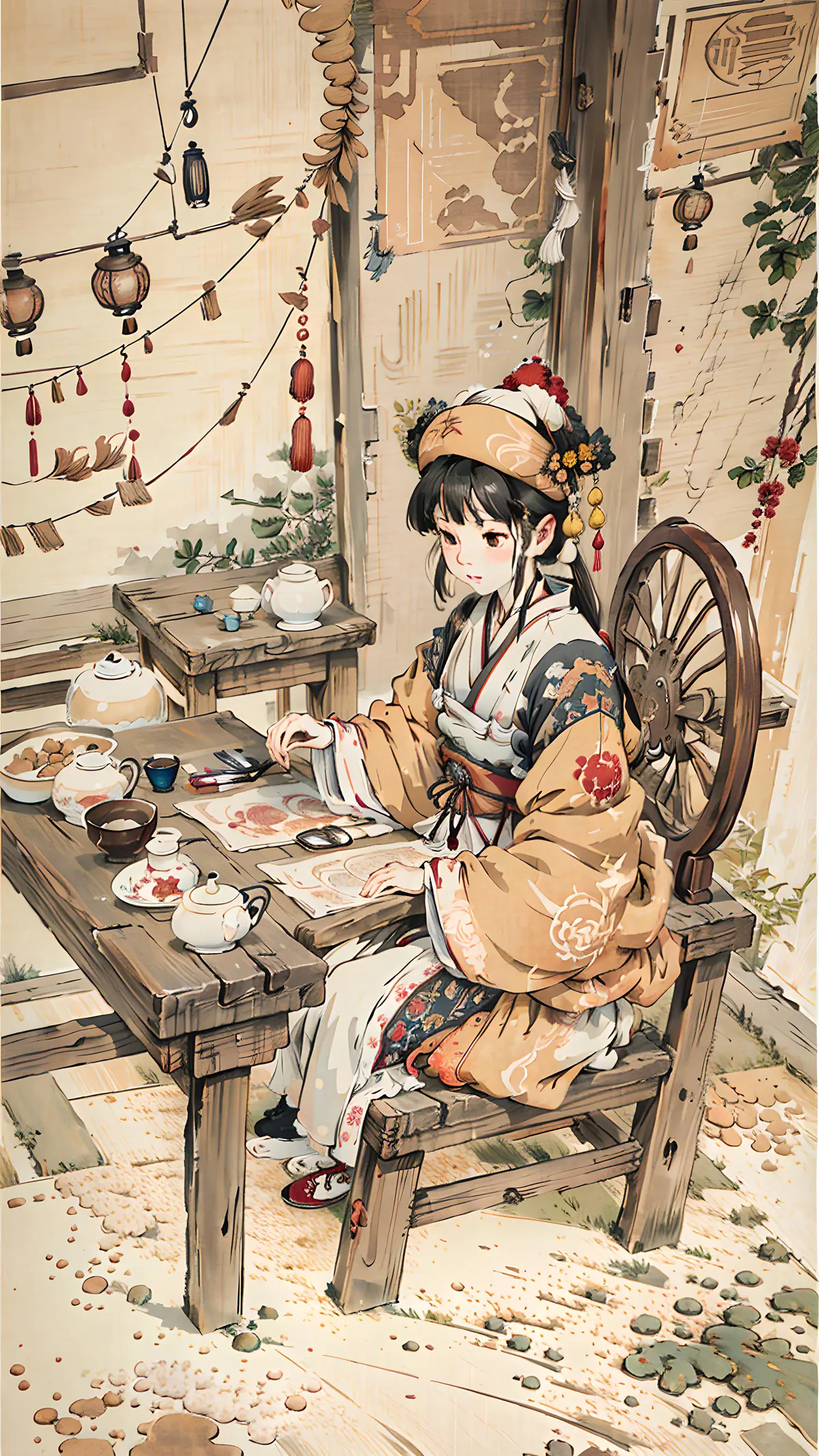 作品中的人物来自阿克苏,她头戴带有典型阿克苏几何纹样的传统花帽,象征新疆悠久的民族工艺与地域精神。案前摆放阿克苏葡萄纹样木雕画纸,背后倚靠着阿克苏木雕所做的椅子。这体现新疆木作雕刻技艺的细腻精妙。而面前的青花...查看更多