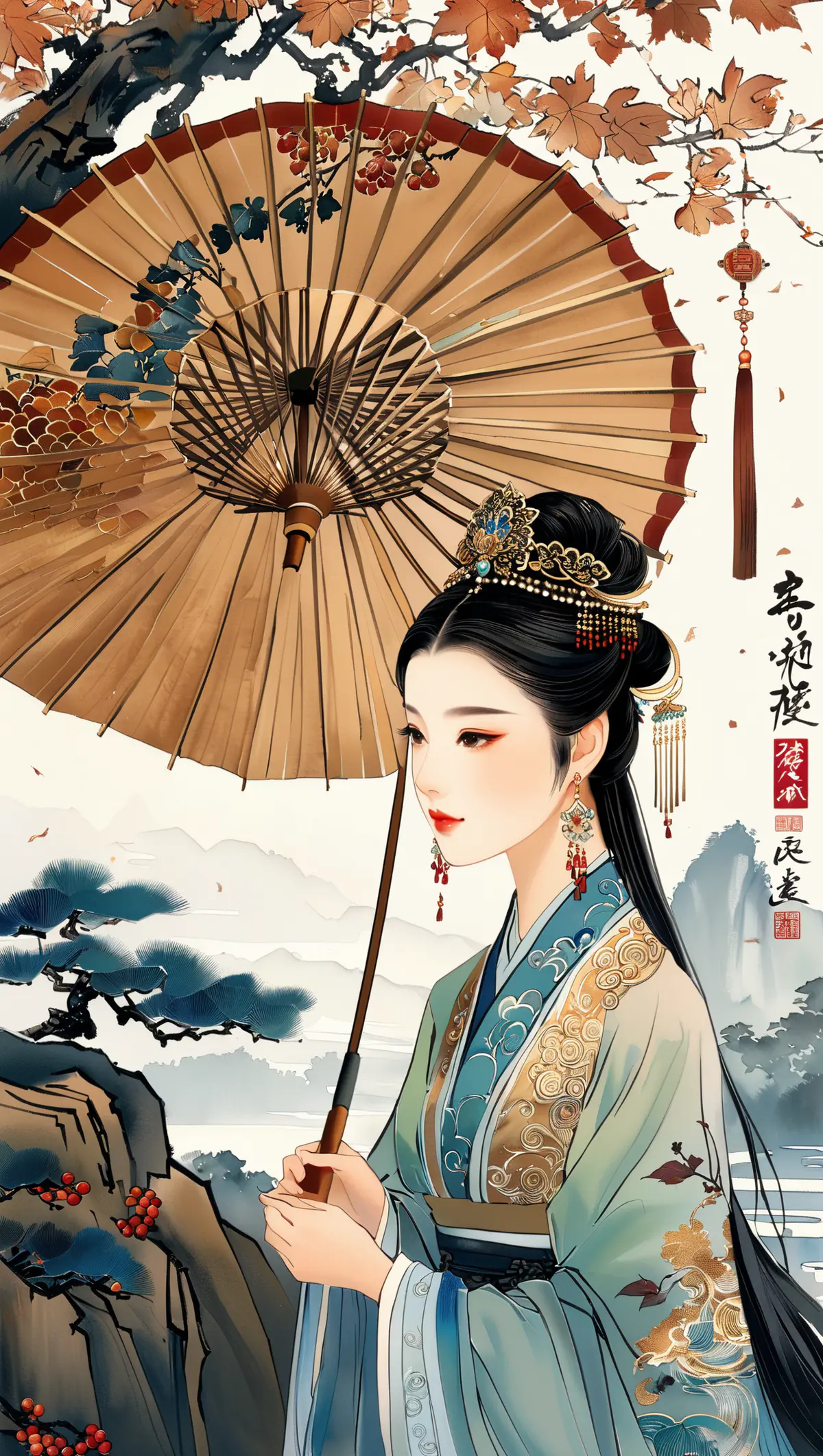 背景为水墨工笔描绘的大龙池景色:塔里木河被淡墨晕染得澄澈透明;鹅卵石湿亮;古树枝叶带细致工笔线条;雨丝轻细如丝;远山以泼墨表达层次墨影。整体画面青绿淡雅、留白适度、带有 2.5D 的立体光影与东方美学的静谧文化气息。