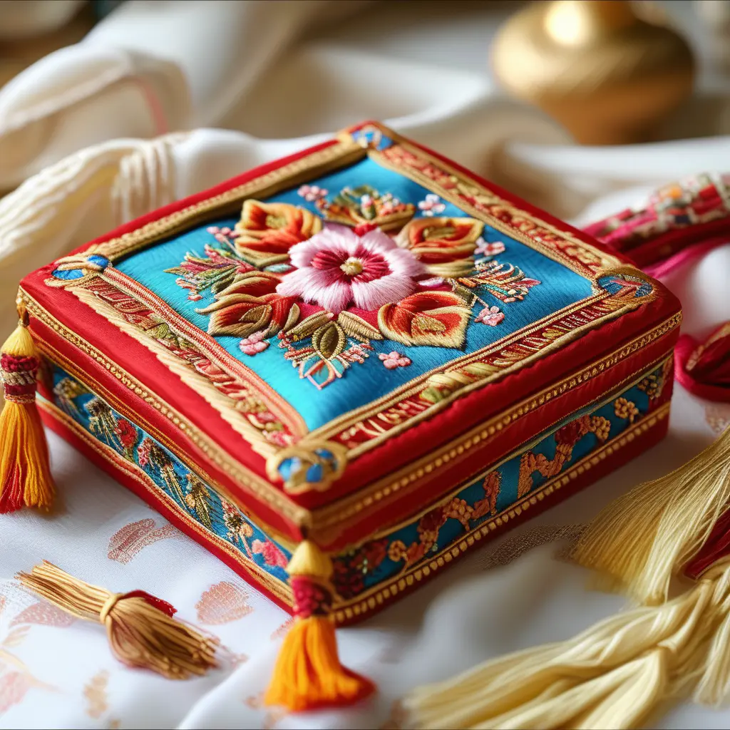 请设计一个丝绸礼盒,要求体现阿克苏柯尔克孜族非遗刺绣文化,,要求能够准确地传递历史经典与非遗文化的精髓,要求有设计感,有创意