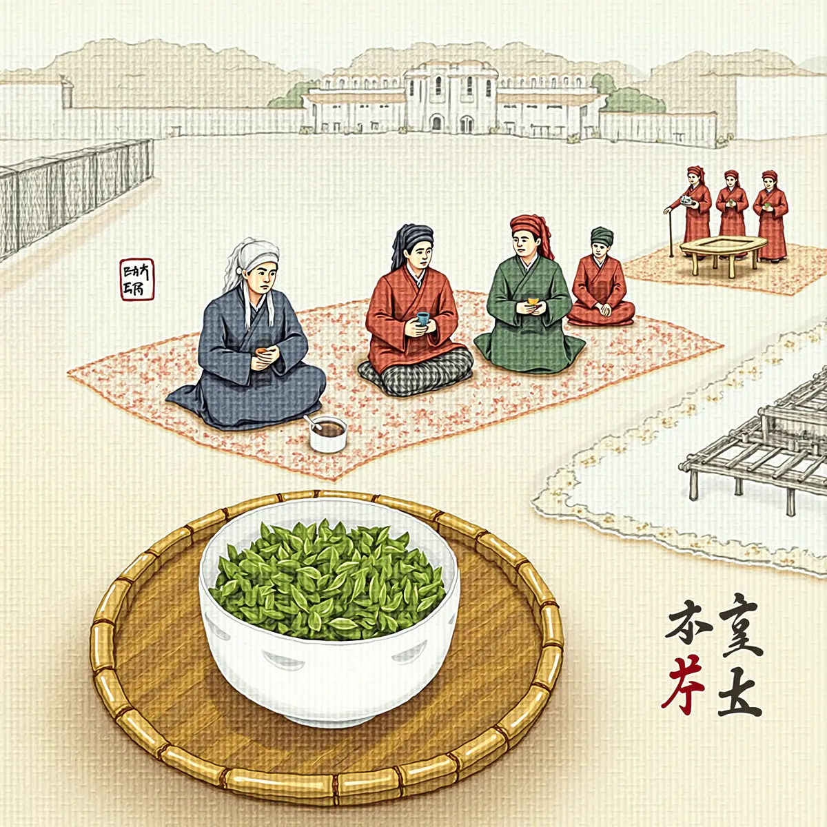 这幅画是带有中式水墨风格的插画:前景是一碗泡着鲜嫩茶叶的绿茶,摆放在竹制托盘上;背景里几位身着民族服饰的手艺人正坐在带有音符图案的地毯上织毯,远处一侧是江南水乡式的白墙黑瓦建筑,另一侧则是沙漠地貌,把不同地域的元素融合在了一起,氛围既传统又灵动。