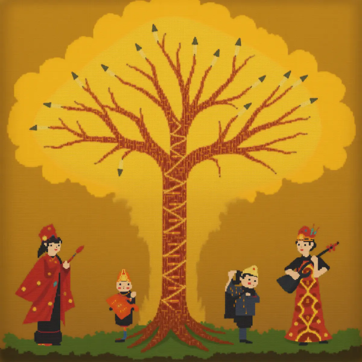 这幅画以金色祥云为背景,核心是一棵缠绕着发光灯带的“文化树”:树枝上挂着民族风格的地毯、传统乐器(形似琵琶),树下一侧是穿汉服的女子手持织毯,另一侧是穿民族服饰的男子弹奏乐器,整体用华丽的色彩和装饰元素,展现了不同文化的交融感。
