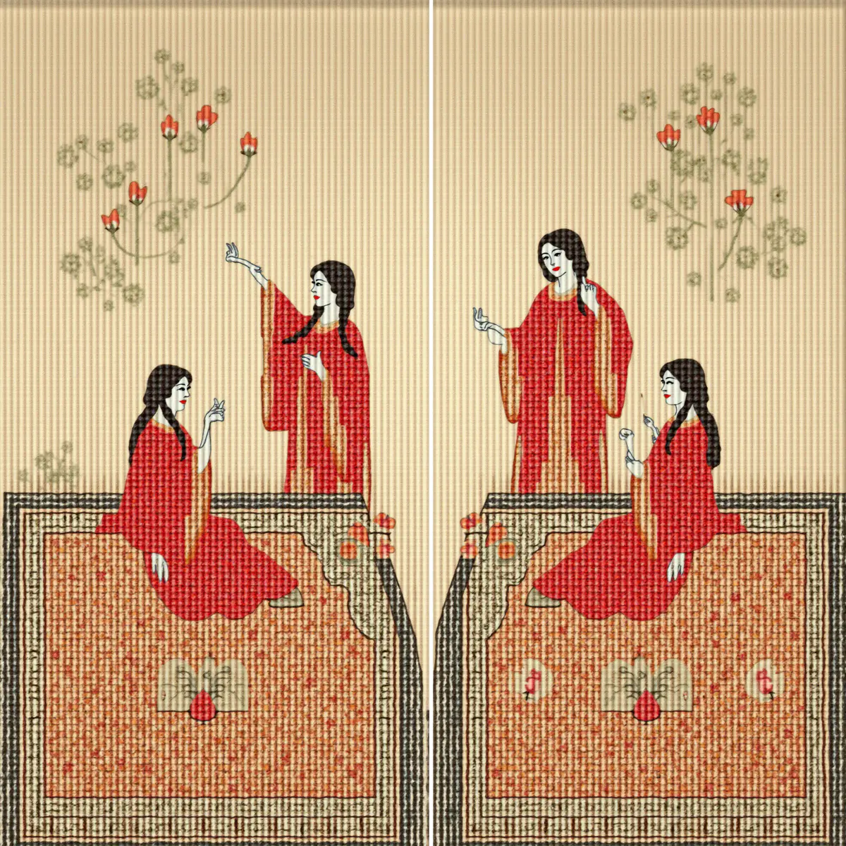 这幅画是左右分栏的装饰风格:左侧是绣着荷花、茶叶的柔美绸缎,右侧是身着红色民族服饰的女子,她梳着长辫、佩戴饰品,正弹奏着乐器,背景是带有几何纹样的地毯,还点缀着石榴元素,把江南的清雅(荷花、茶叶)和民族风情(服饰、乐器)结合得很和谐。