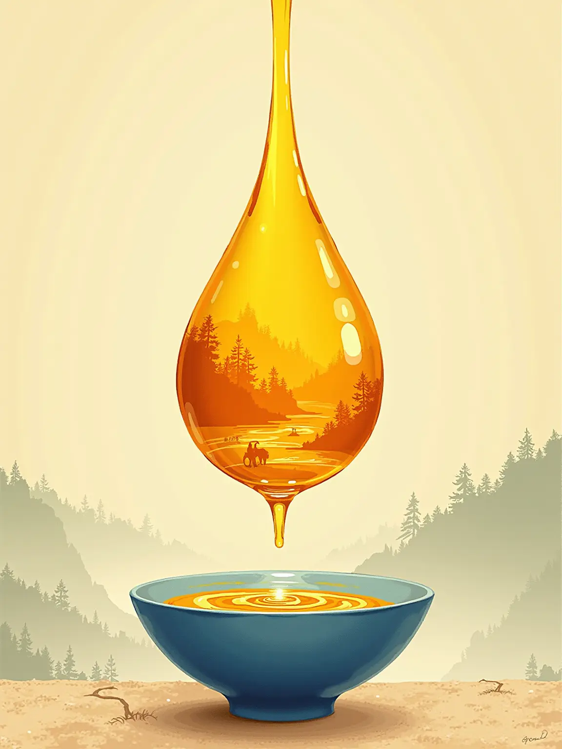 新国风插画,一滴巨大的琥珀色黄酒作为核心,酒滴内映照出浙江酿酒与阿克苏采摘水果的融合场景。酒滴正落入一只青瓷碗中,碗中涟漪呈现出天山雪水汇入钱塘江的脉络。背景是温暖的黄昏色调,充满生活气息与诗意。画风细腻,线条灵动如工笔,色彩通透如水彩,由艺术家鹿荷绘制,充满叙事性。