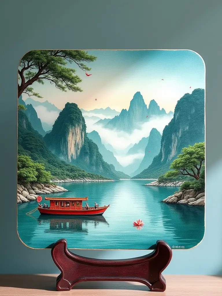 一块方形有圆润四角,上面绘有 幅精美的刺绣作品悬于中央,前景是浙江嘉兴的南湖红船静静地停泊在湖面,中景则是阿克苏的托木尔峰雪山的壮丽景色,背景融合了浙江的千岛湖群岛与阿克苏的库车王府。一束柔和的灯光聚焦在刺绣...查看更多
