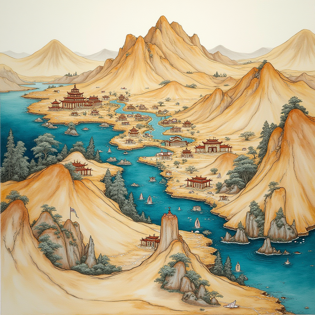 以撞色笔触织就地域的诗意共生:暖金如浪的天山余脉(取阿克苏荒漠山峦之形),骤然被一泓浙水裁开——清碧溪涧里,浮着乌篷小楫,岸畔是黛瓦飞檐的江南水榭(融浙江园林之韵),丹柱映着沙岩,曲廊绕着驼铃余音。