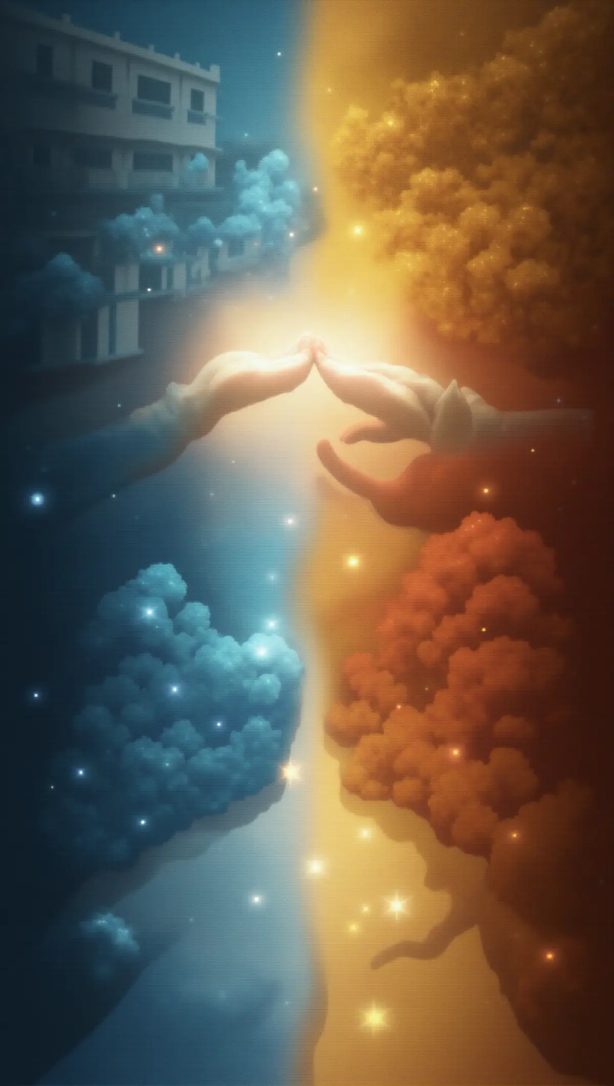 画面中央一条发光的丝带路连接左右。左侧江南水乡,白墙黛瓦前漂浮着青瓷器,蓝色丝绸如水流般飘动。右侧西域沙漠,金色胡杨树下绽放着红黄相间的艾德莱斯绸。正中两位工匠的手即将相触,迸发出彩色光芒,光芒中浮现传统花纹和数字粒子。整体色调左青右金,空中飘浮着细小的光点和流动的数据纹。
