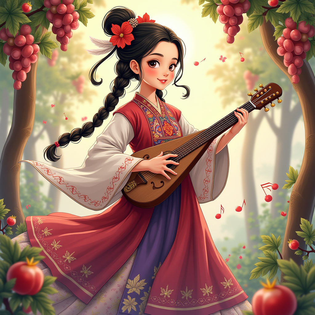 画面中的维吾尔族少女头戴绣着木卡姆纹样的小花帽,服饰点缀柯尔克孜族刺绣细节,怀抱一把小巧的都塔尔乐器,身处阿克苏标志性的葡萄林与石榴果场景里,音符随着弦音在果林间轻扬。
