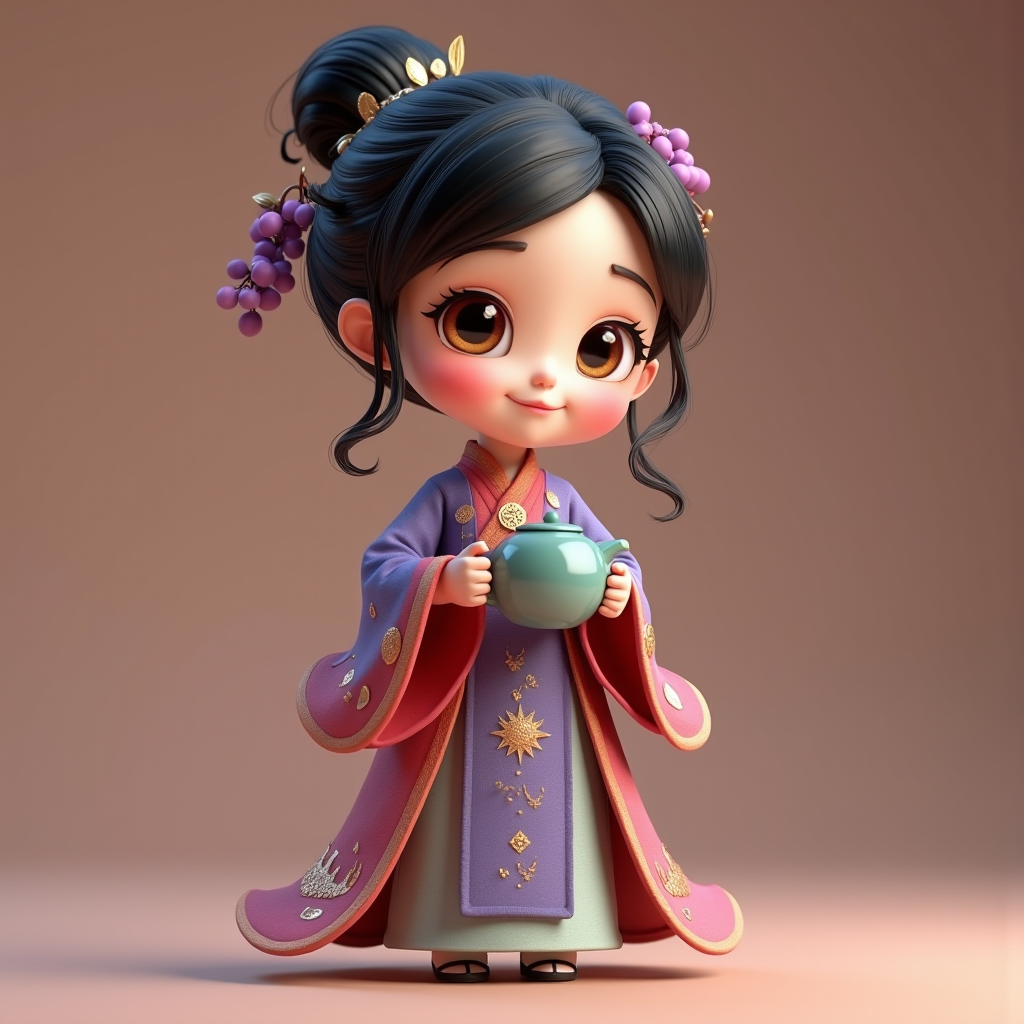 Pixar-style full-body cute Chinese girl, chibi-ish proportions, large sparkling amber eyes, round soft cheeks, small nose, gentle sweet smile, slightly oversized head for cuteness, short soft black waves in hair, small cluster of translucent purple grapes on one side of her head, delicate gold leaf pins, whimsical and playful cartoon style, extremely cute.