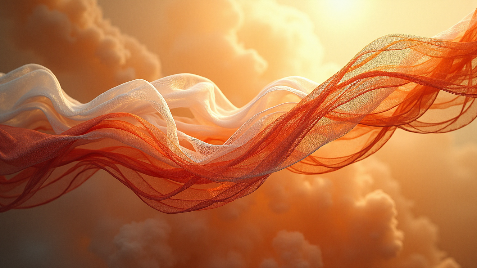 丝绸与棉线在空中交织成璀璨丝路意象,江南水墨与新疆戈壁金色沙面并存,汉服纹理融合维吾尔族刺绣花纹,柔光、飘带与织机图腾交错呈现,东西合璧的织造之美与历史延展感