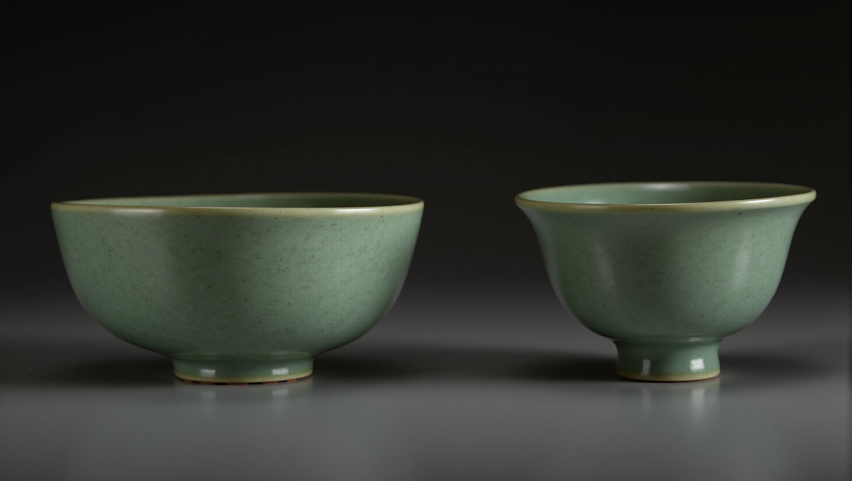青瓷釉色如湖光,碗壁与器面浮现柯尔克孜族刺绣几何花纹,雪山与湖泊在青瓷中映射,马奶酒铜壶与茶香蒸汽相互交融,中华纹样与中亚纹样相契