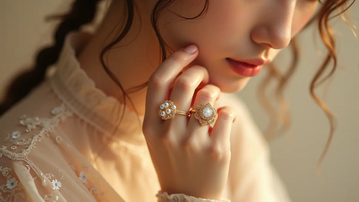 珍珠光泽化作胡杨树年轮,沙漠金色与江南雾气相结合,少女与胡杨守护者意象,维吾尔族花帽与江南丝带同构饰品,珍珠凝成泪与希望的象征,生命力的复苏与文化守护主题